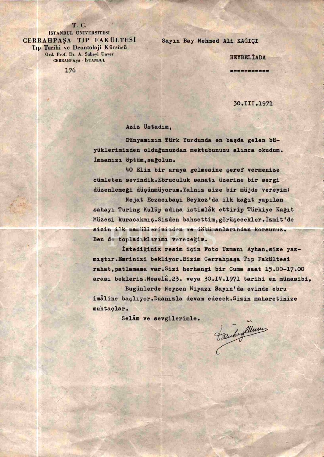 A. Süheyl Ünver´in Mehmet Ali Kâğıtçı´ya yazdığı 1971 tarihli ıslak imzalı mektup, 20x 30 cm
