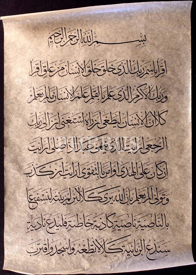 Emine (Uzun) ketebeli ve 1438 tarihli sülüs Alak suresi, 50x64 cm