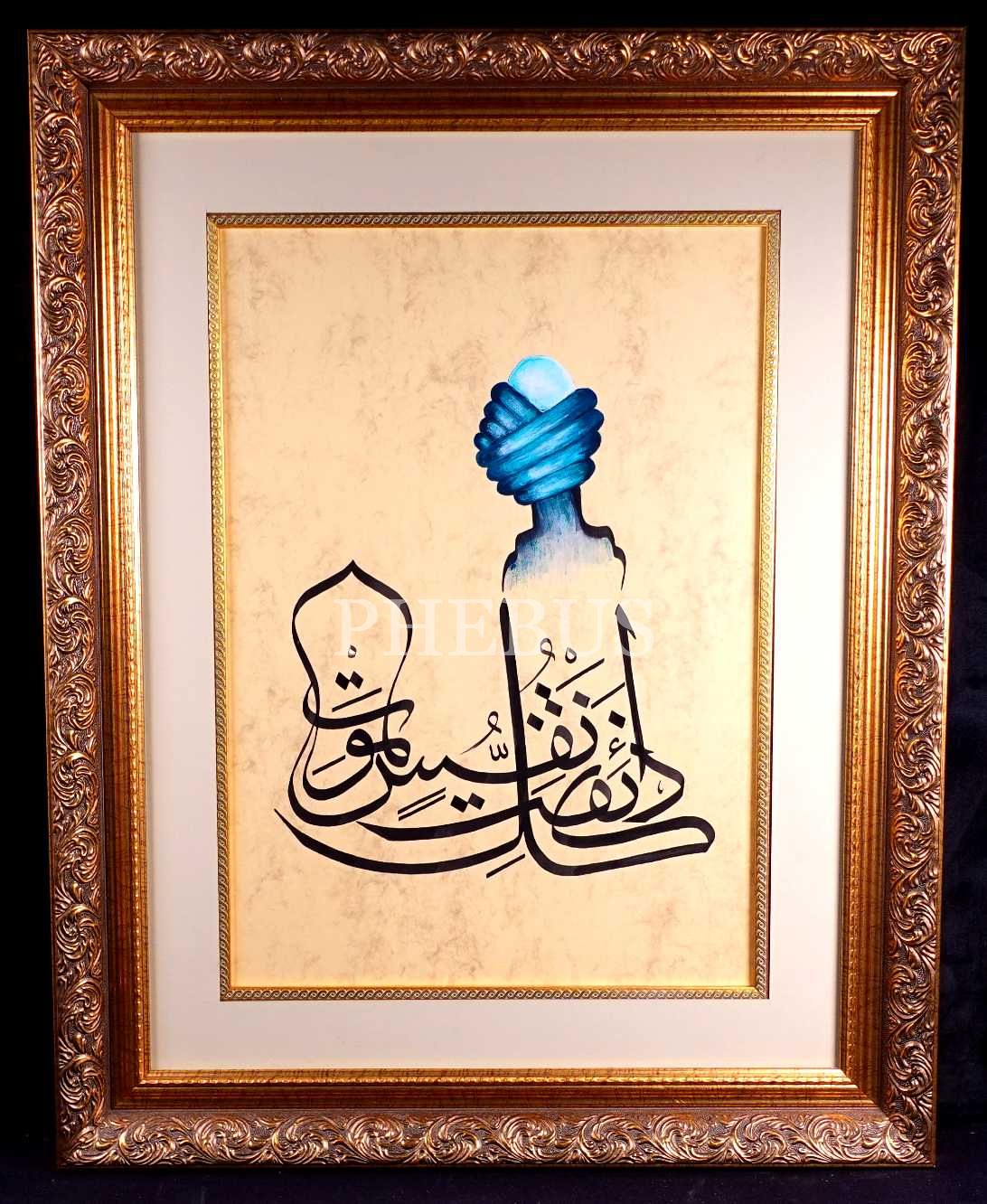 Derviş sarığı tasvirli celî sülüs ayet (Ankebût/57), 52x76 cm