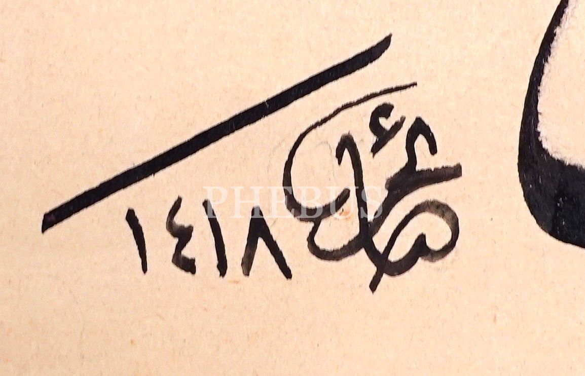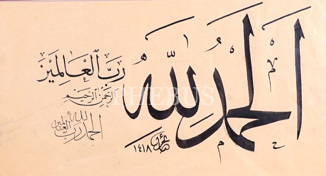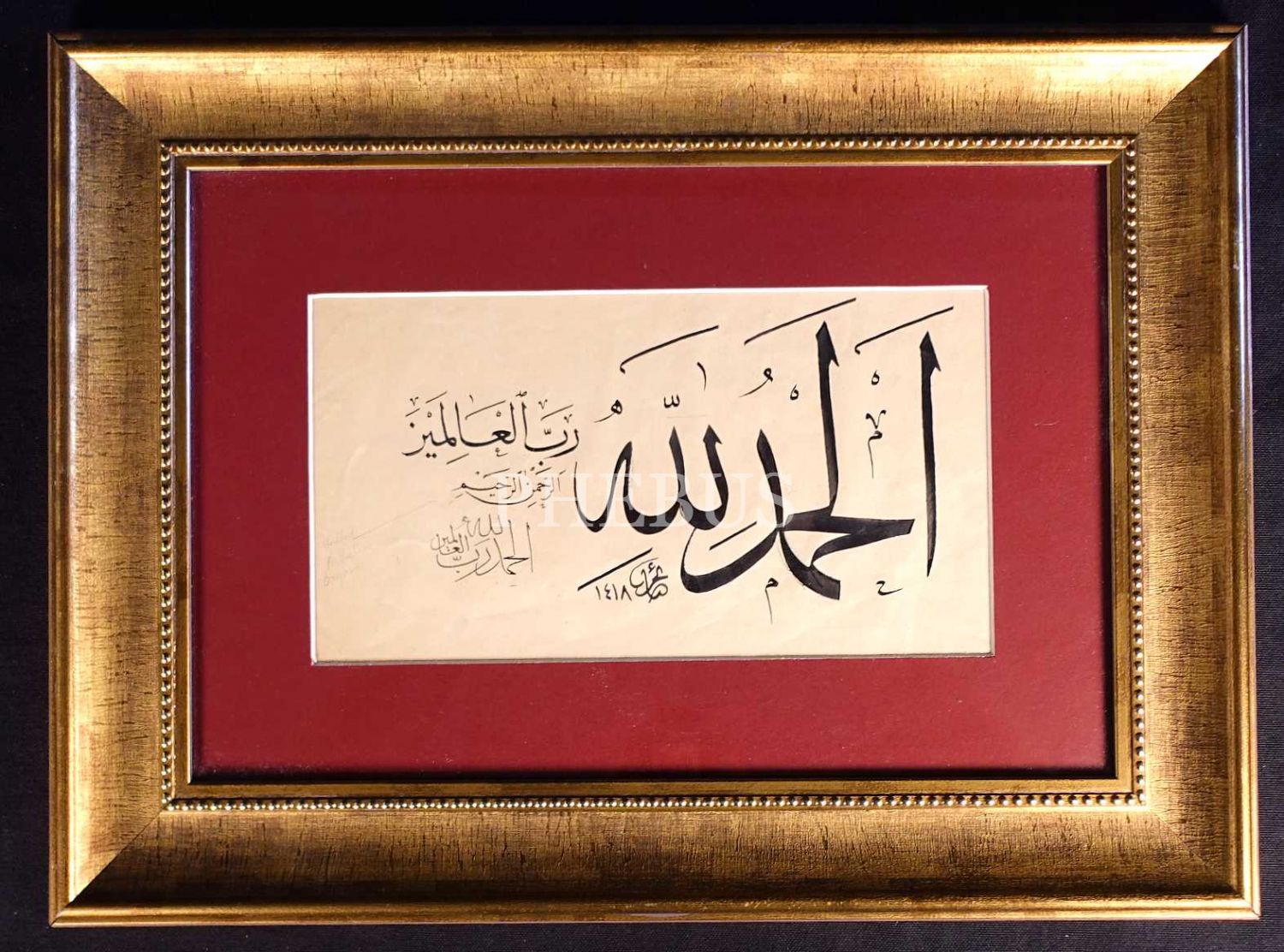 Saim Özel ketebeli ve 1418 tarihli sülüs-nesih hatla "el-Hamdü lillâhi Rabbi´l-Âlemîn", 14x23 cm