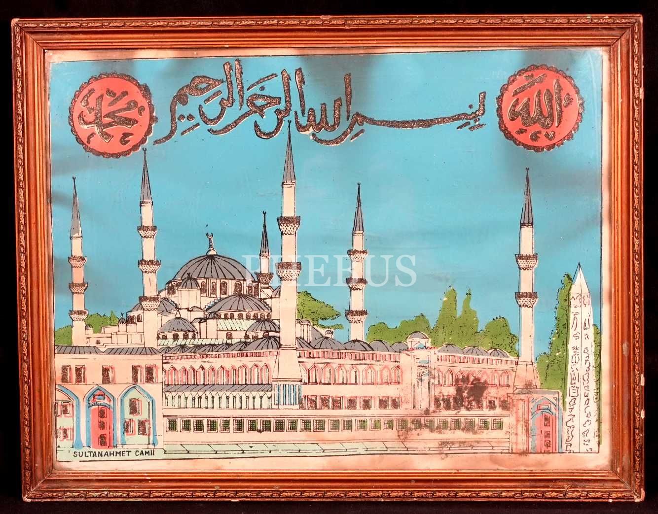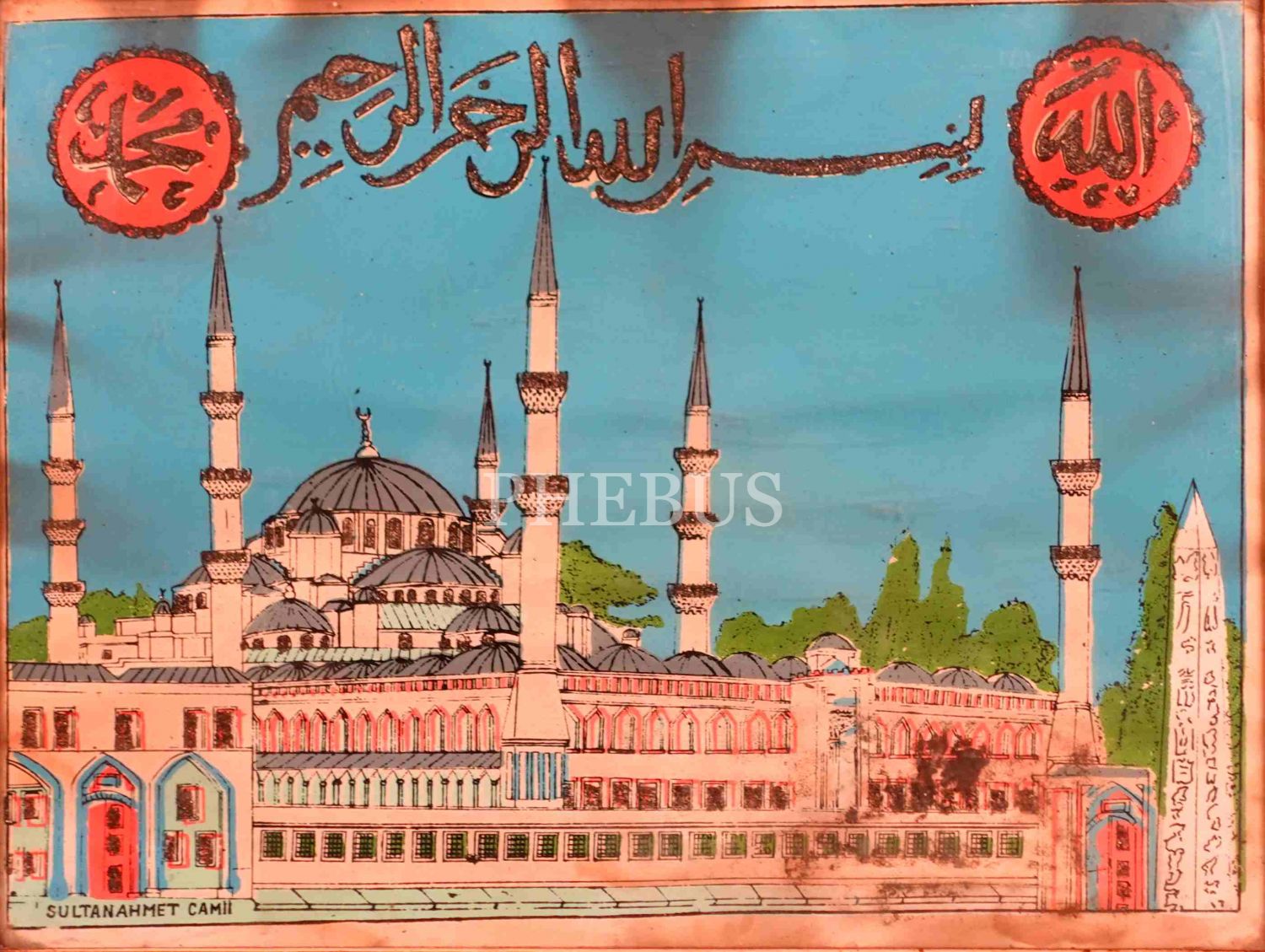 Erken dönem baskı Sultan Ahmed Camii tasviri üzerine sim kabartmalı besmele, "Allah (cc)" ve "Muhammed (asm)" lafızları, 35x45 cm