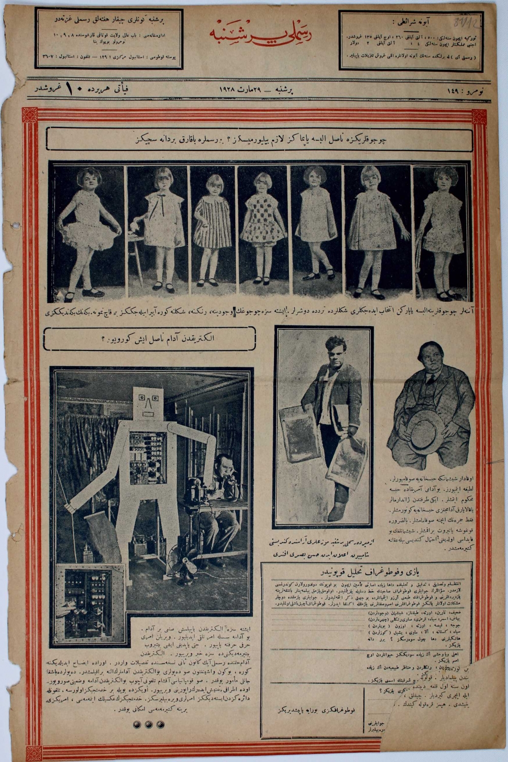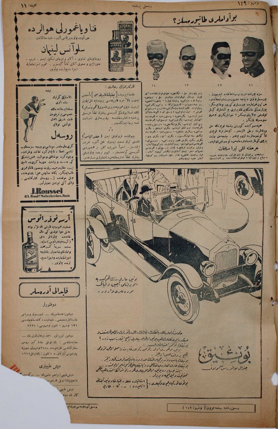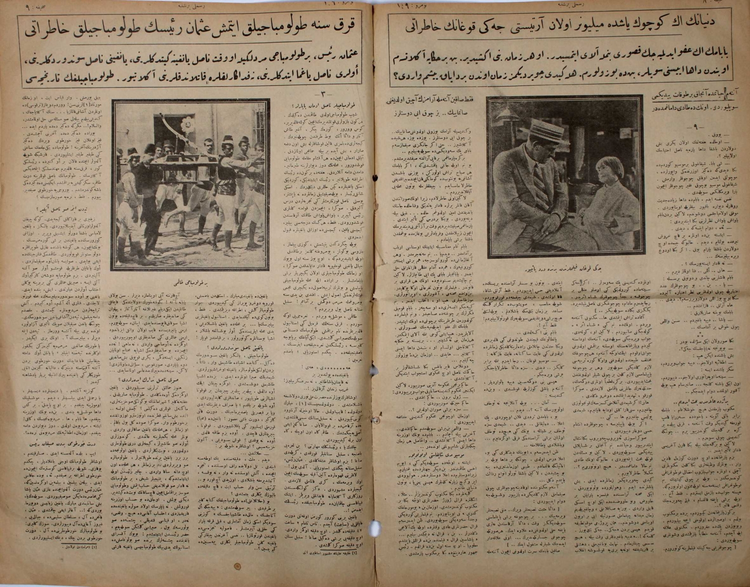 Dikkat çeken başlıklar: "Enver Paşa'nın Türkistan'da İmparatorluğu Tesis İçin Aldığı Tertibat Ve Oynadığı Oyunlar", "Rus Saraylarında Emsalsiz Aşk Macerası Yaşayan bir Türk Genci" , ön ve arka kapak bir kenarı haliyle, 12 sayfa, 28x44 cm