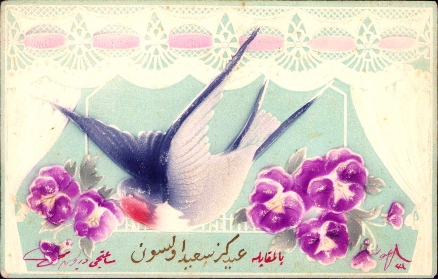 Osmanlıca gofre bayram tebrik kartı, "Iydiniz said olsun", arkası Osmanlıca ithaflı.