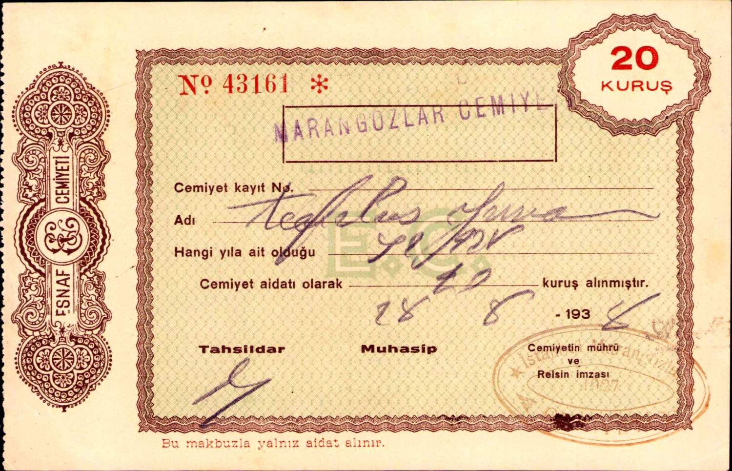 Esnaf Cemiyetine ait aidat makbuzu, 17x11 cm.