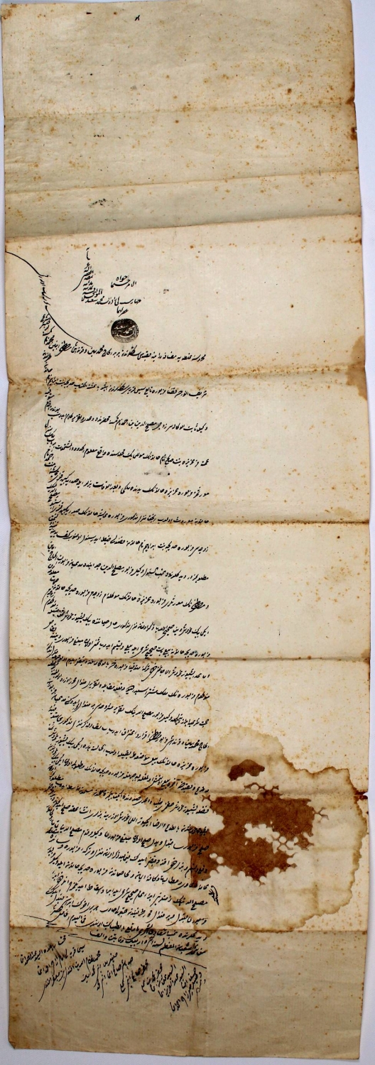 Osmanlı kadı mühürlü Galata semtinde El Hac Mustafa Emin ve kardeşi Azize hanıma ait müştemilat ve bir bab dükkana ait olan hüccet kaydı, 21x65 cm.