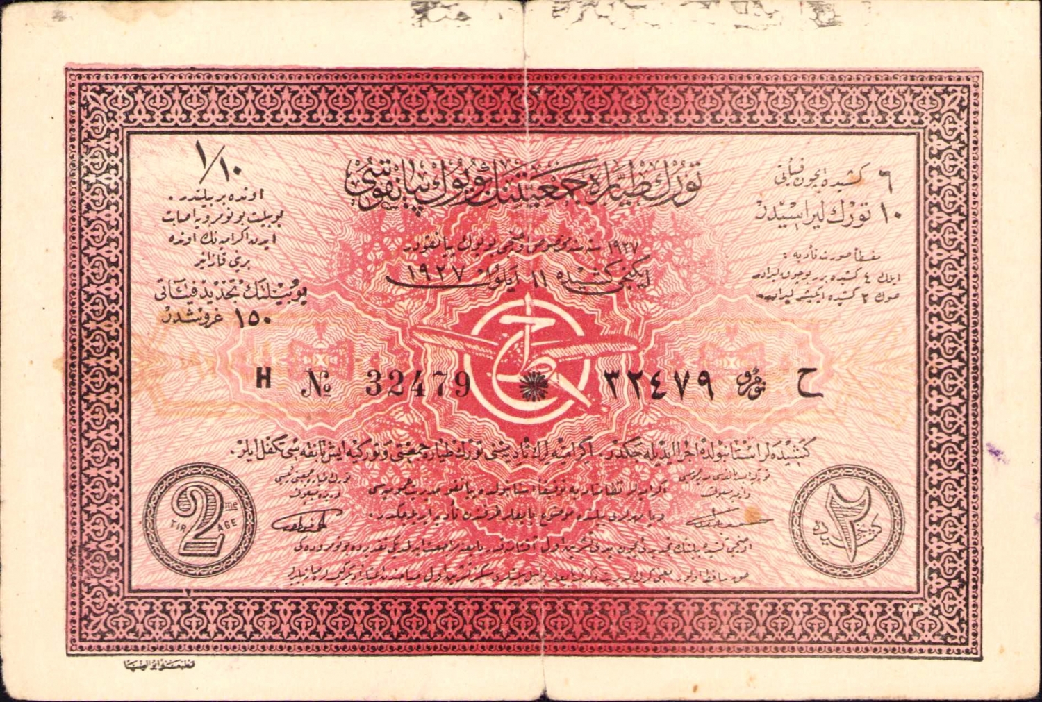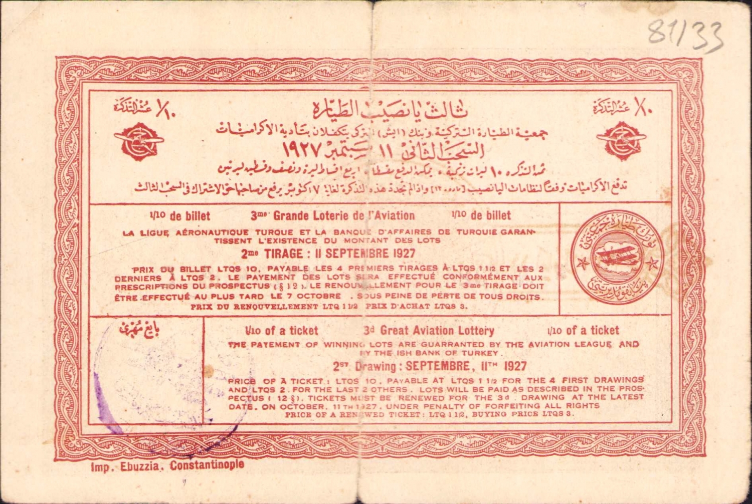 Osmanlıca Türk Tayyare Cemiyeti piyango bileti, 11x16 cm.