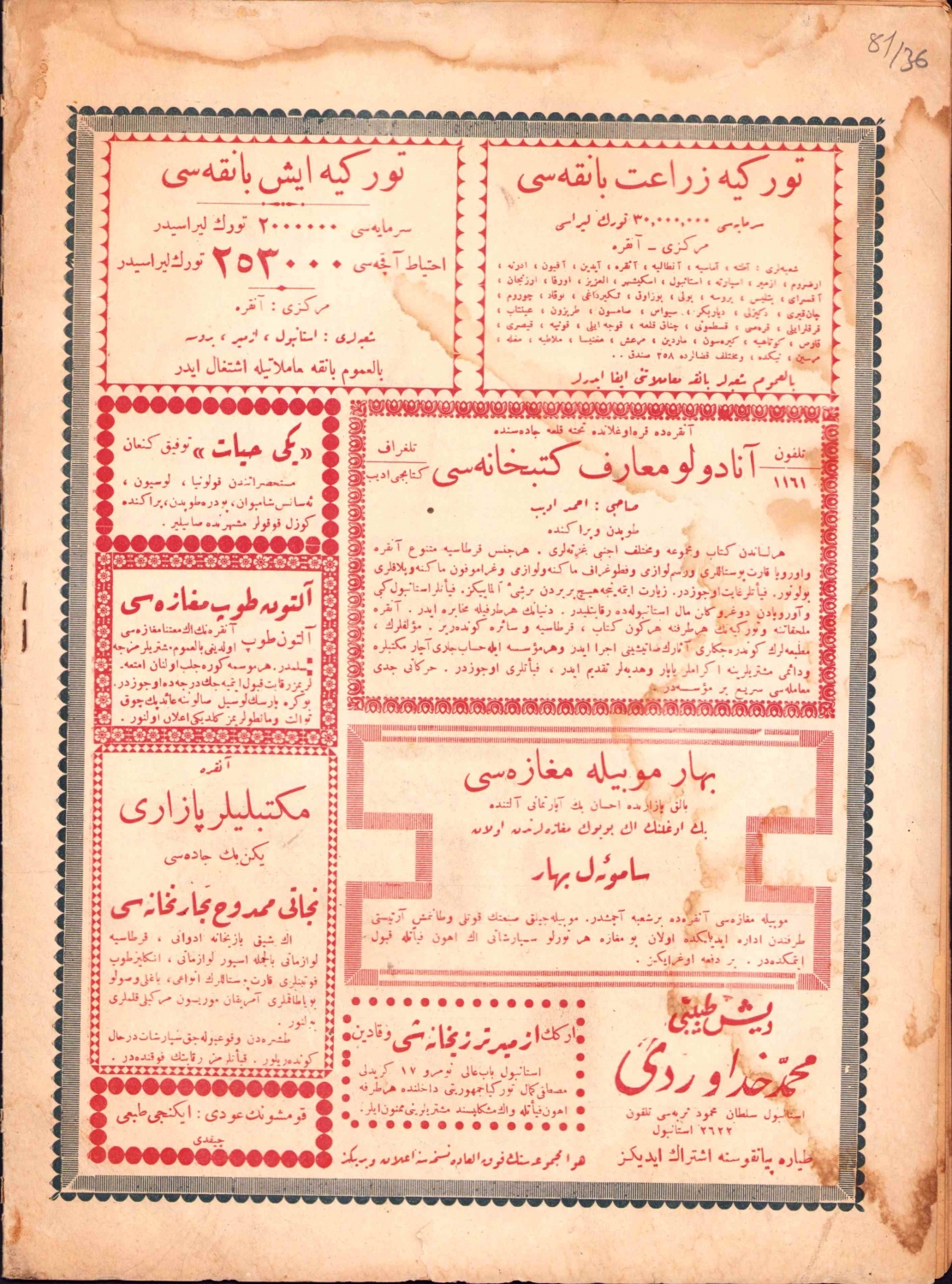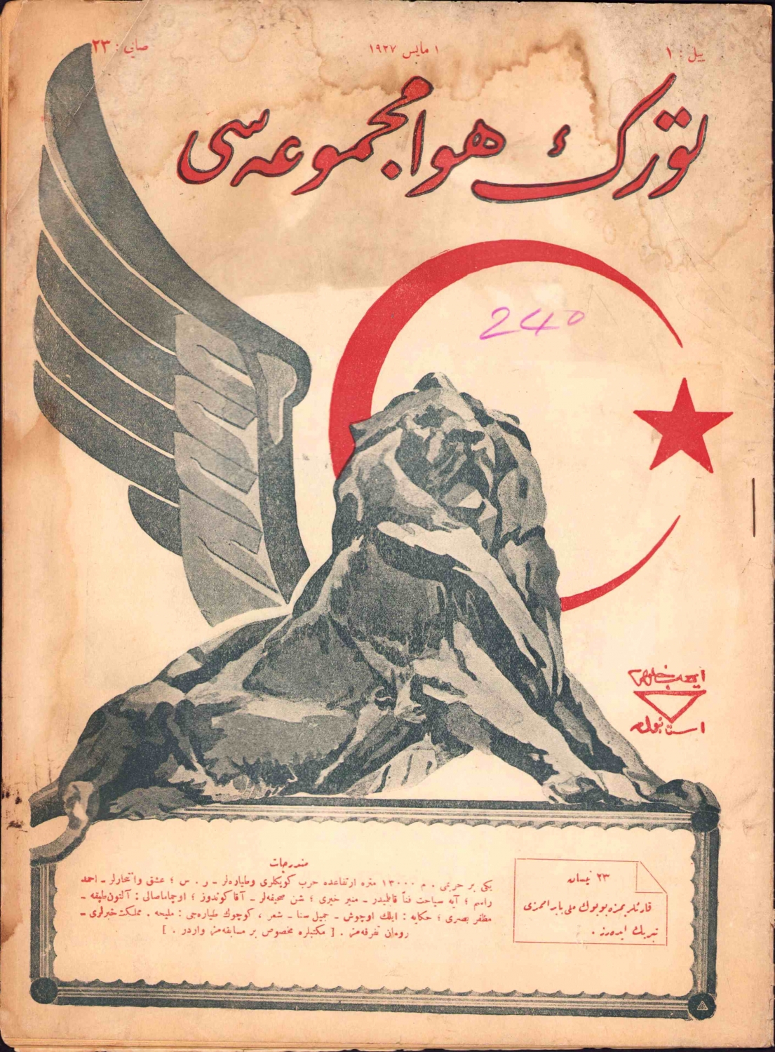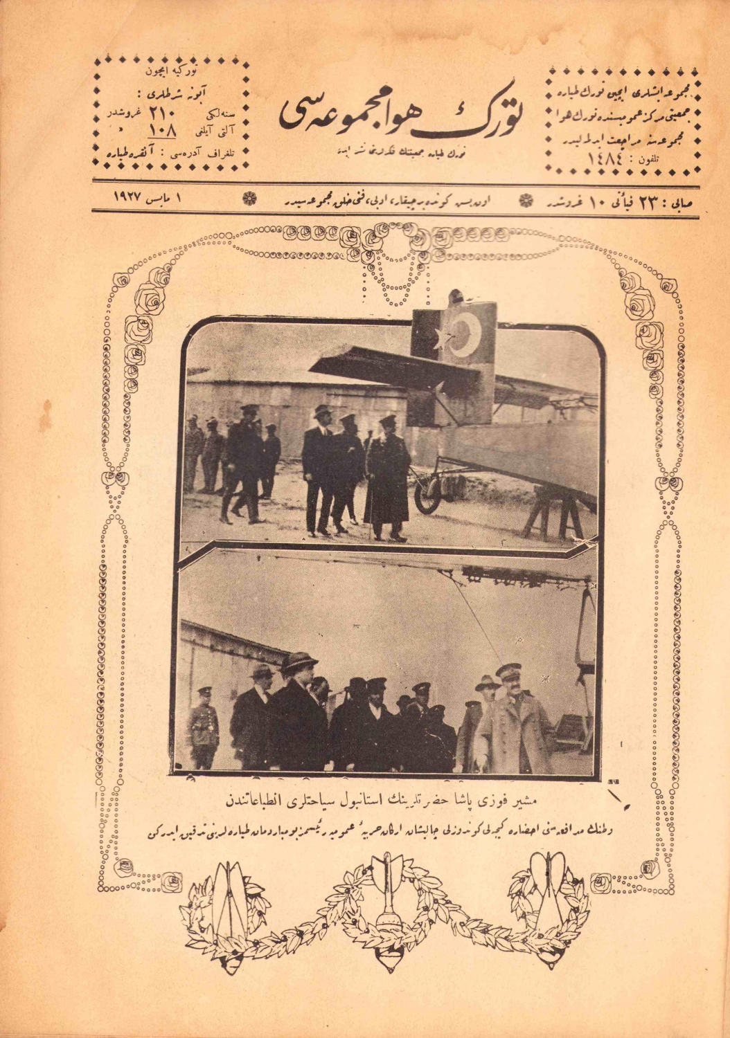 Osmanlıca 1927 tarihli Türk Hava Mecmuası, iç kapak; "Meşhur Fevzi Paşa Hazretlerinin İstanbul Seyahatleri İnzibatından, resimli, ön kapak bir kenarı kırık, 24 sayfa, 24x33 cm.