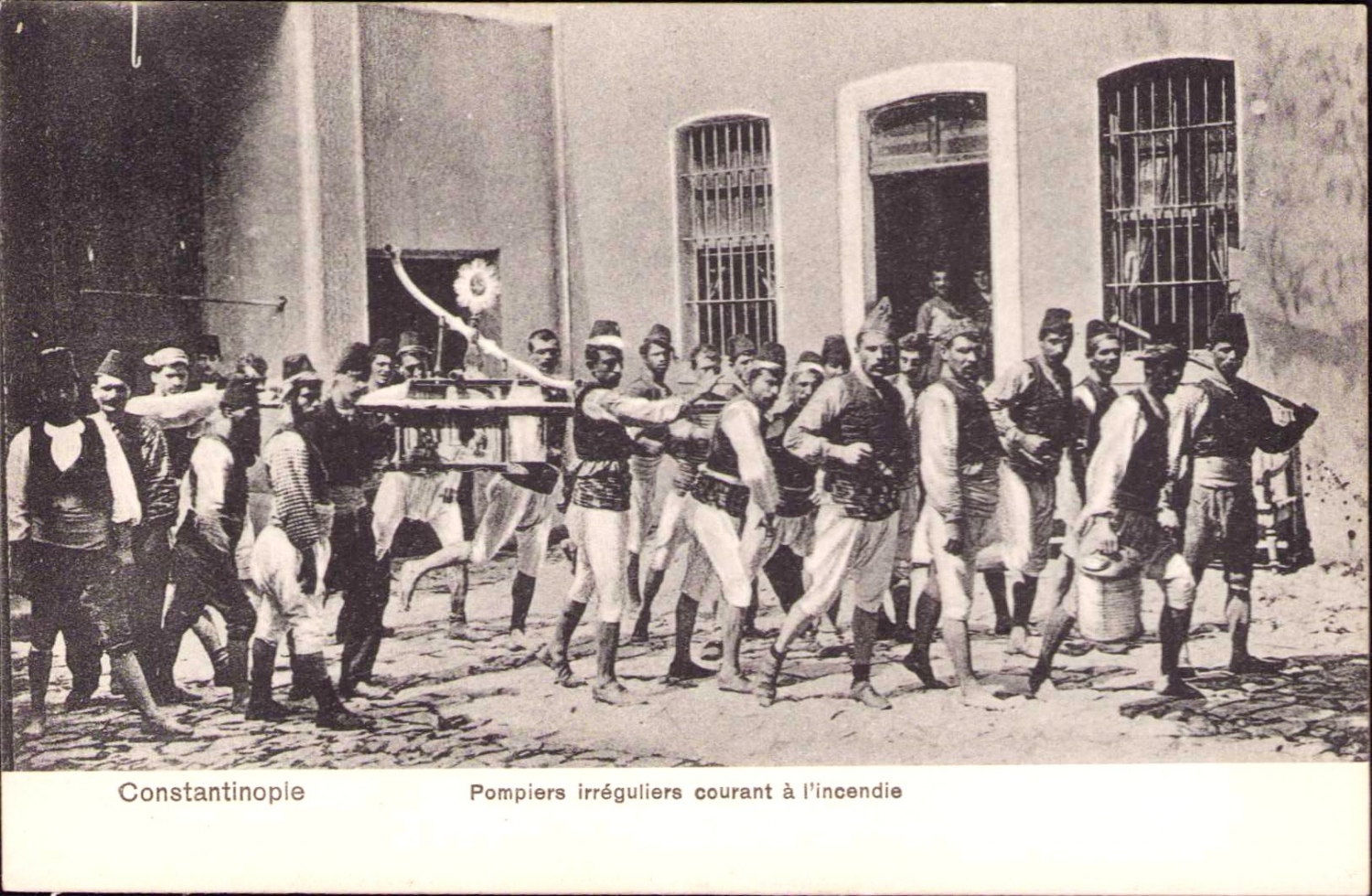 Osmanlı dönemi meslek kartpostalı, İtfaiyeciler, Constantinople, Editeurs Au Bon Marché, Pera.
