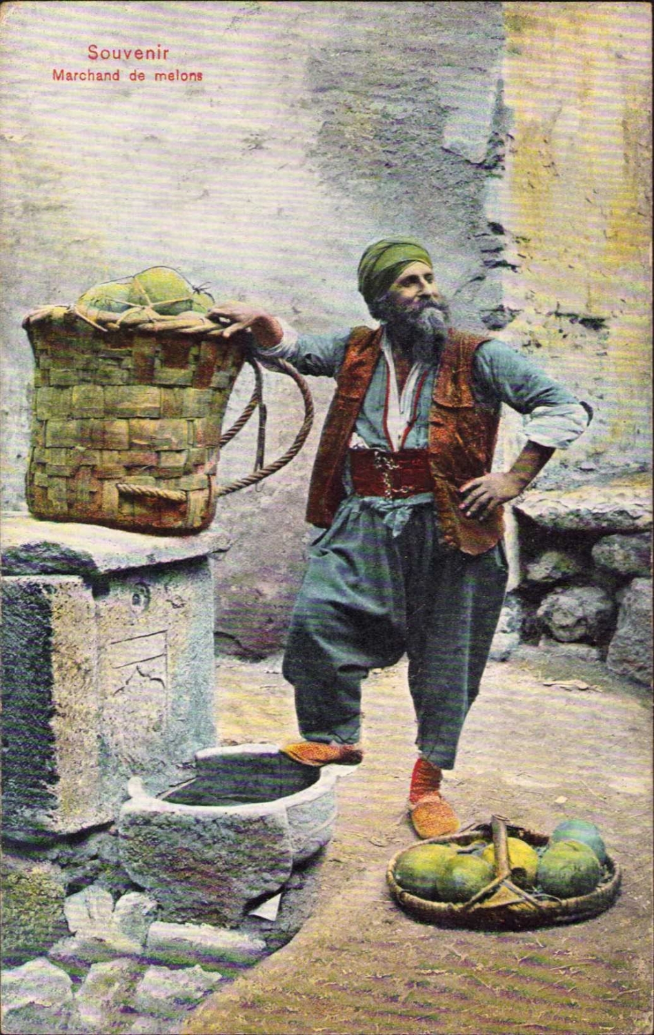 Osmanlı dönemi meslek kartpostalı, Kavun satıcısı, Editeur Max Fruchtermann, Constantinople.