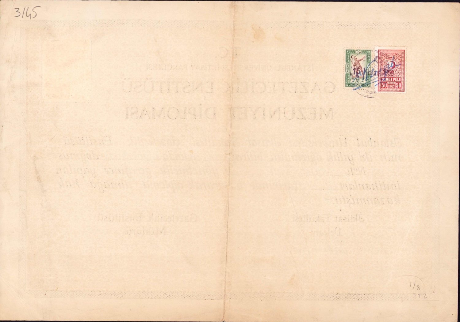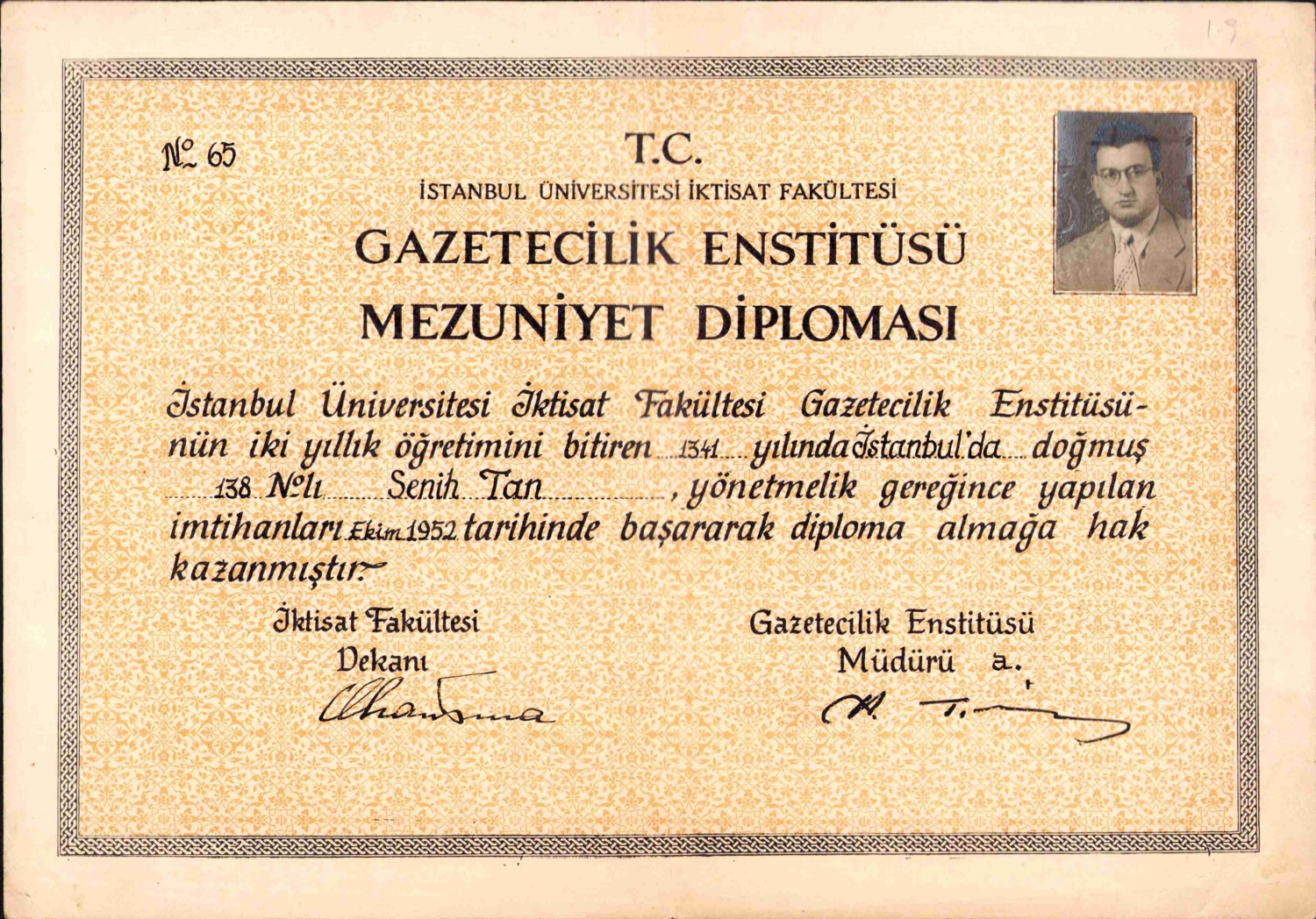İstanbul Üniversitesi İktisat Fakültesi Gazetecilik Enstitüsü Mezuniyet Diploması, 23x33 cm.