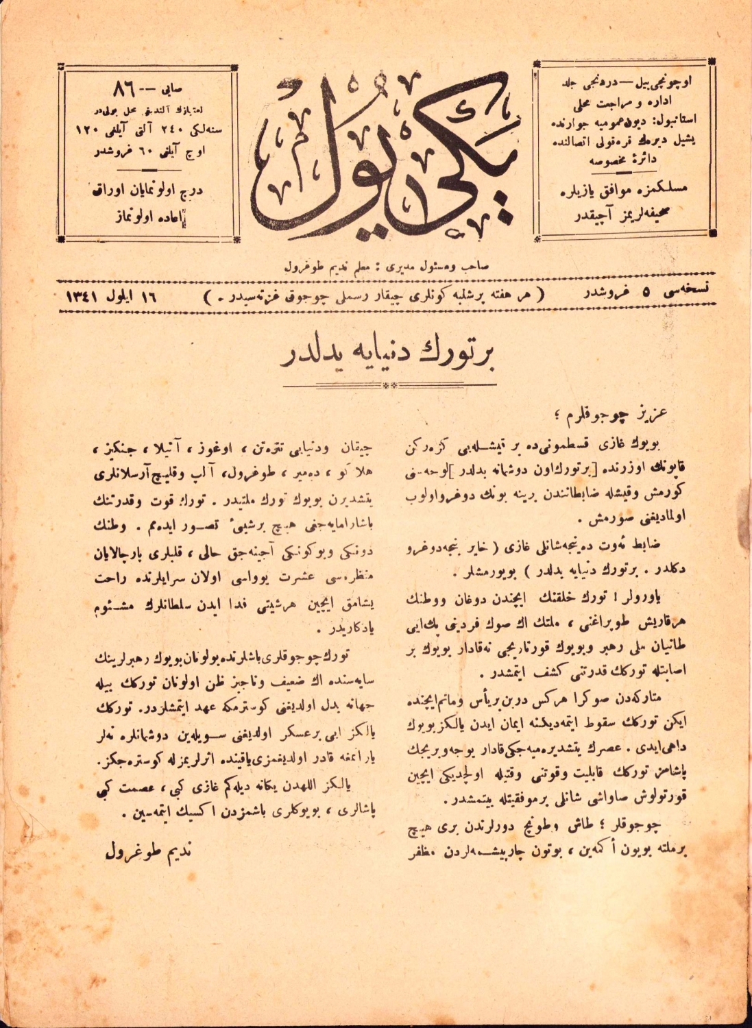 Osmanlıca hicri 1341 tarihli Yeni Yol gazetesi, "Bir Türk Dünyaya Bedeldir", haliyle, 15 sayfa, 21x29 cm.
