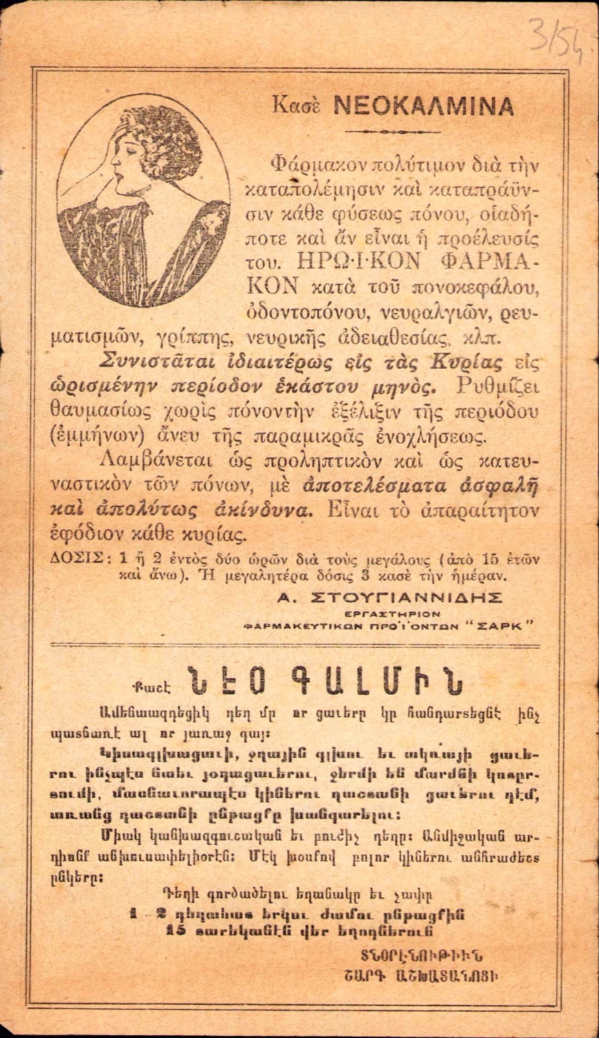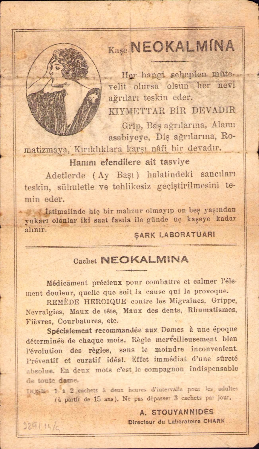 Türkçe, Fransızca, Rumca ve Ermenice dört dilde 'Kaşe NEOKALMINA' ilaç tanıtım broşürü, 11x19 cm.