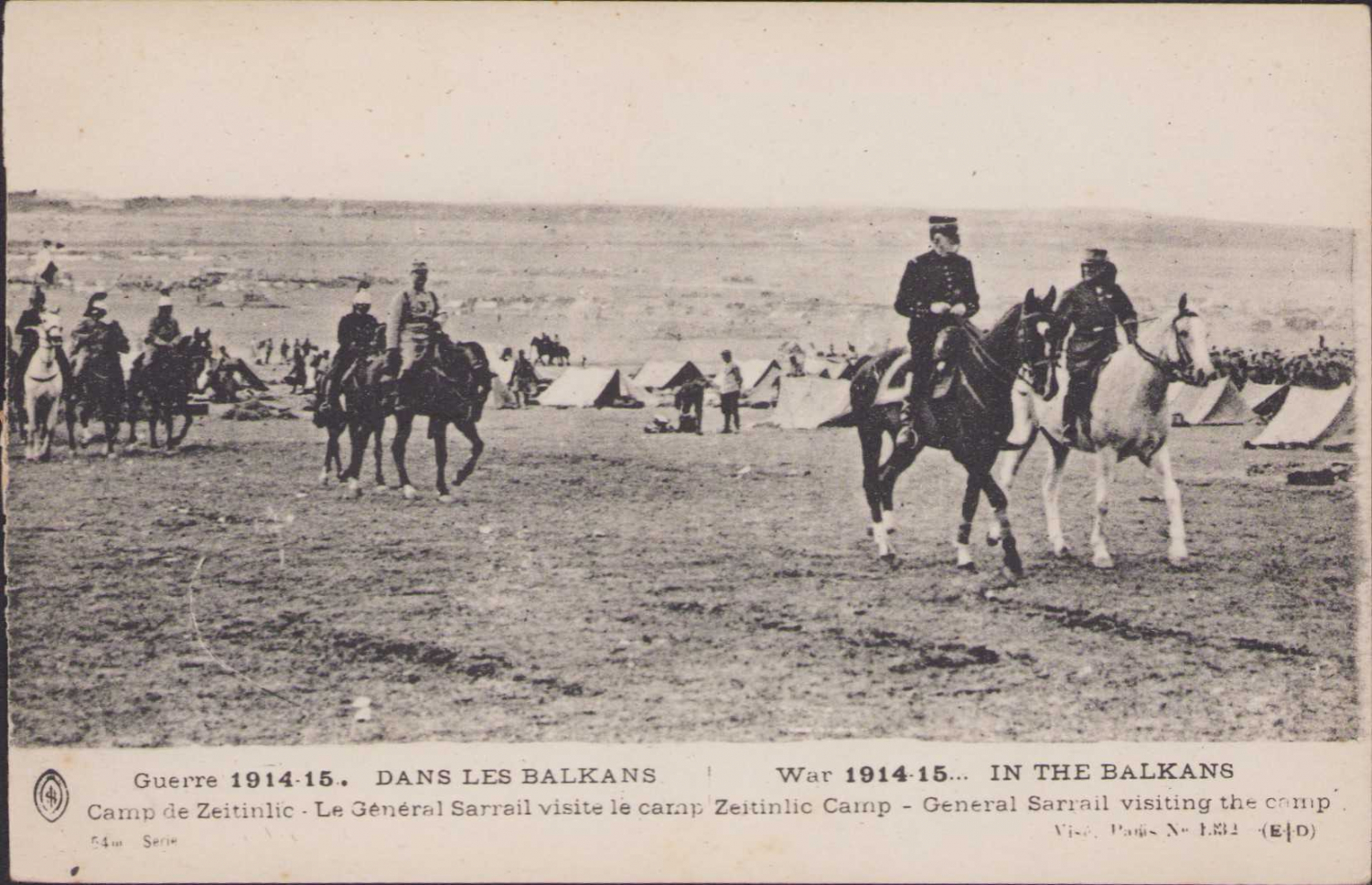 Balkan Savaşı, Fransız Generali Sarrail'in Çanakkale Zeytinlik Kampı ziyareti, Fransa baskısı, Fransızca ve İngilizce yazılı kartpostal