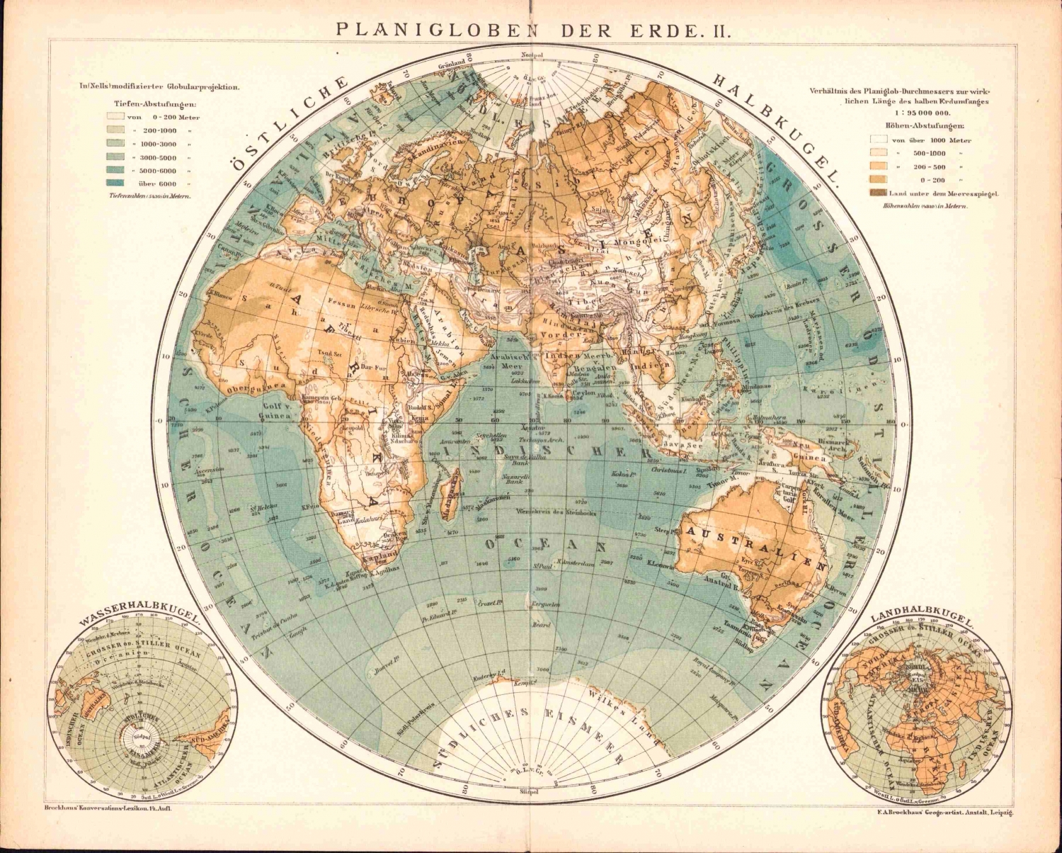 Almanca Dünya haritası, Leipzig baskı, 31x25 cm.