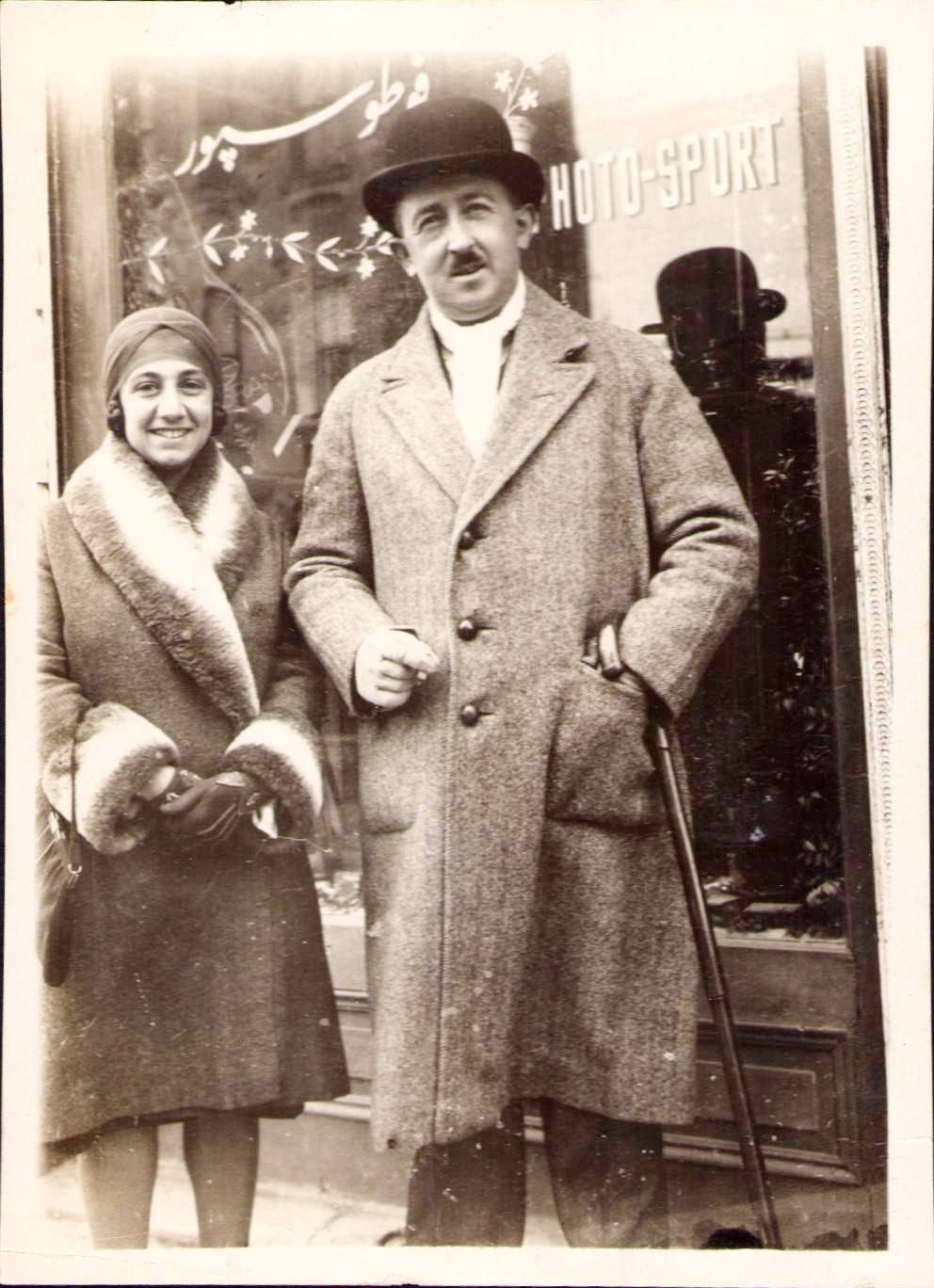 Osmanlıca - Fransızca iki dilde Photo - Sport yazılı dükkan önünde beyefendi ve hanımefendi, 9x12 cm.