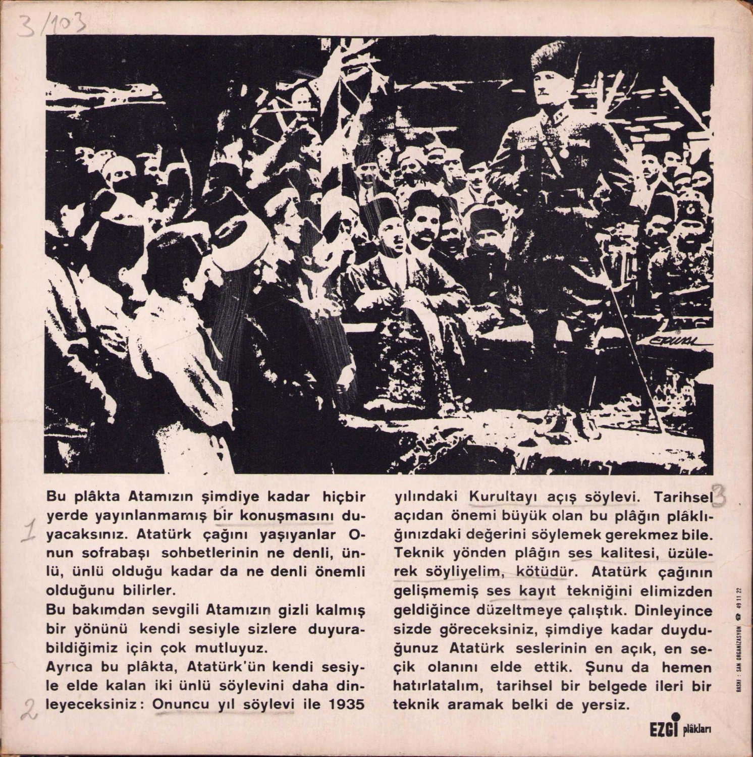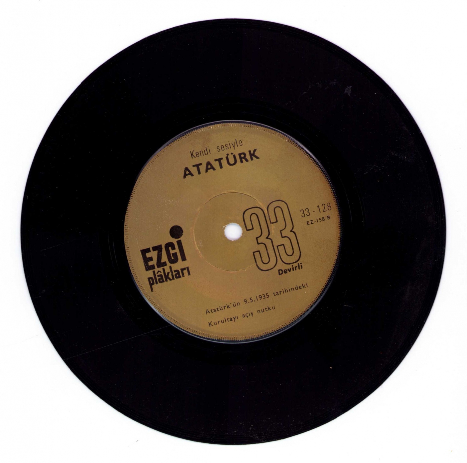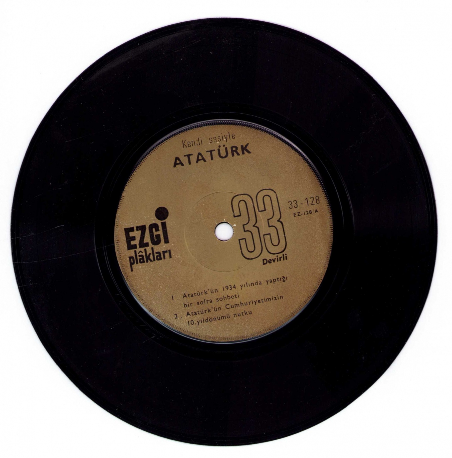 33 devirli 45'lik Kendi Sesiyle Atatürk'e ait plak: 1. Atatürk'ün 1934 yılında yaptığı bir sofra sohbeti, 2. Atatürk Cumhuriyetimizin 10. yıldönümü nutku, 3. 1935 yılındaki kurultayı açış söylevi
