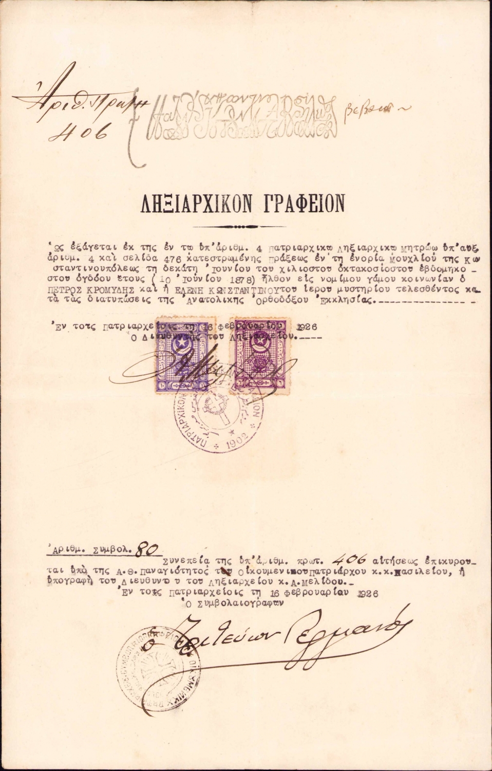 Osmanlıca - Rumca 'Rum Patriği Nüfus Müdüriyeti' damgalı, 1926 tarihli Rumca doküman, 20x34 cm