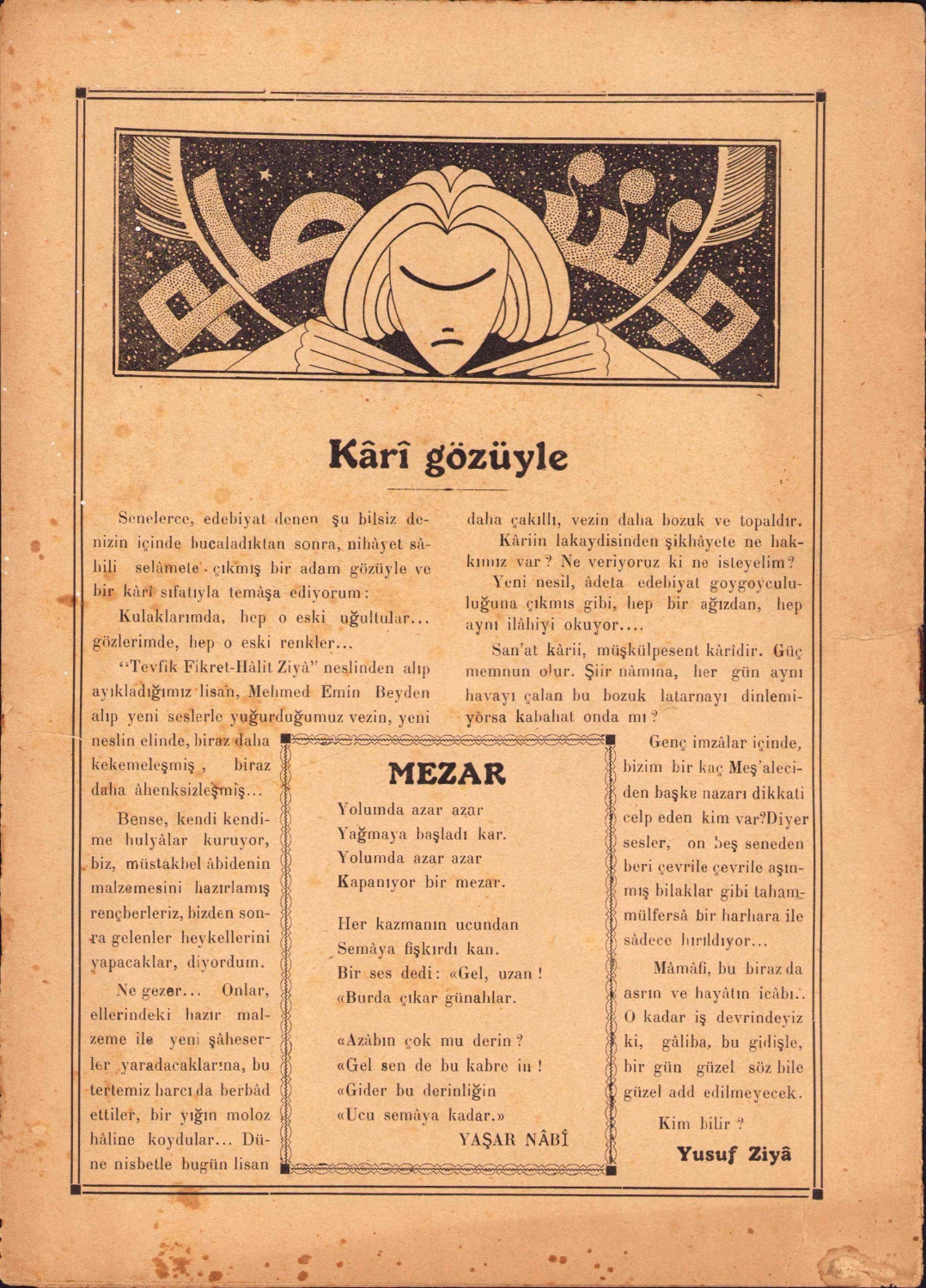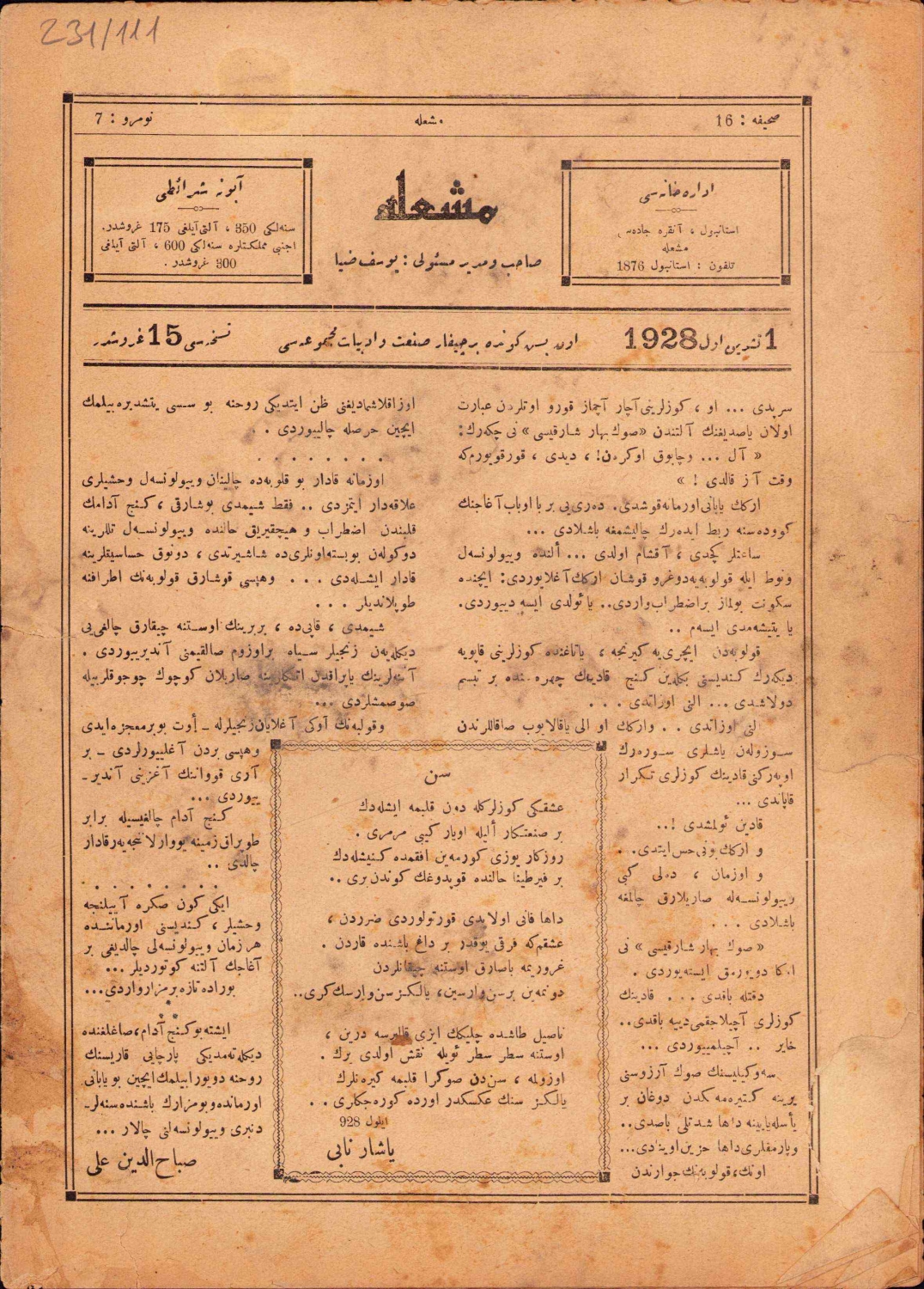 Osmanlıca Meşale mecmuası, 1928 tarihli, ciltsiz, sayfaların bazıları haliyle, 16 sayfa, 20x28 cm.
