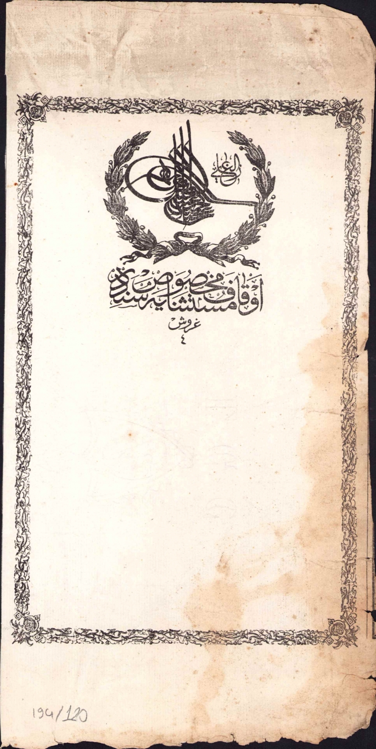 Evkaf-ı Müstenaya mahsus senet, bir kenar haliyle, 20x40 cm.