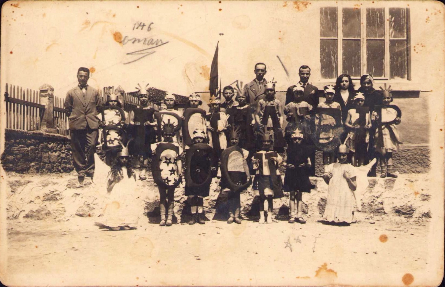 "BİR CİHANDIR ÇOCUK" pankartlı çocuklar, bayram kutlamaları, 1930lar