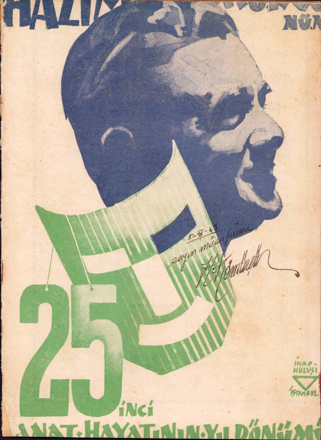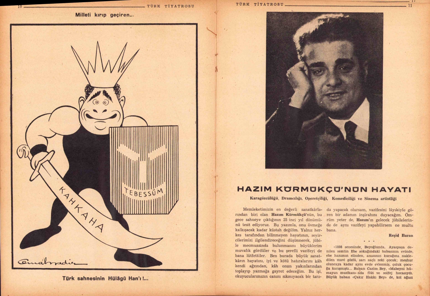1942 tarihli Türk Tiyatrosu mecmuası: İhap Hulusi kapaklı Türk sahnesinin değerli sanatkarı Hazım Körmükçü'nün 25inci sanat yılına özel hazırlanan fevkalade müsamere programı, Hazım Körmükçü imzalı, resimli, 32 sayfa, 19x26 cm.