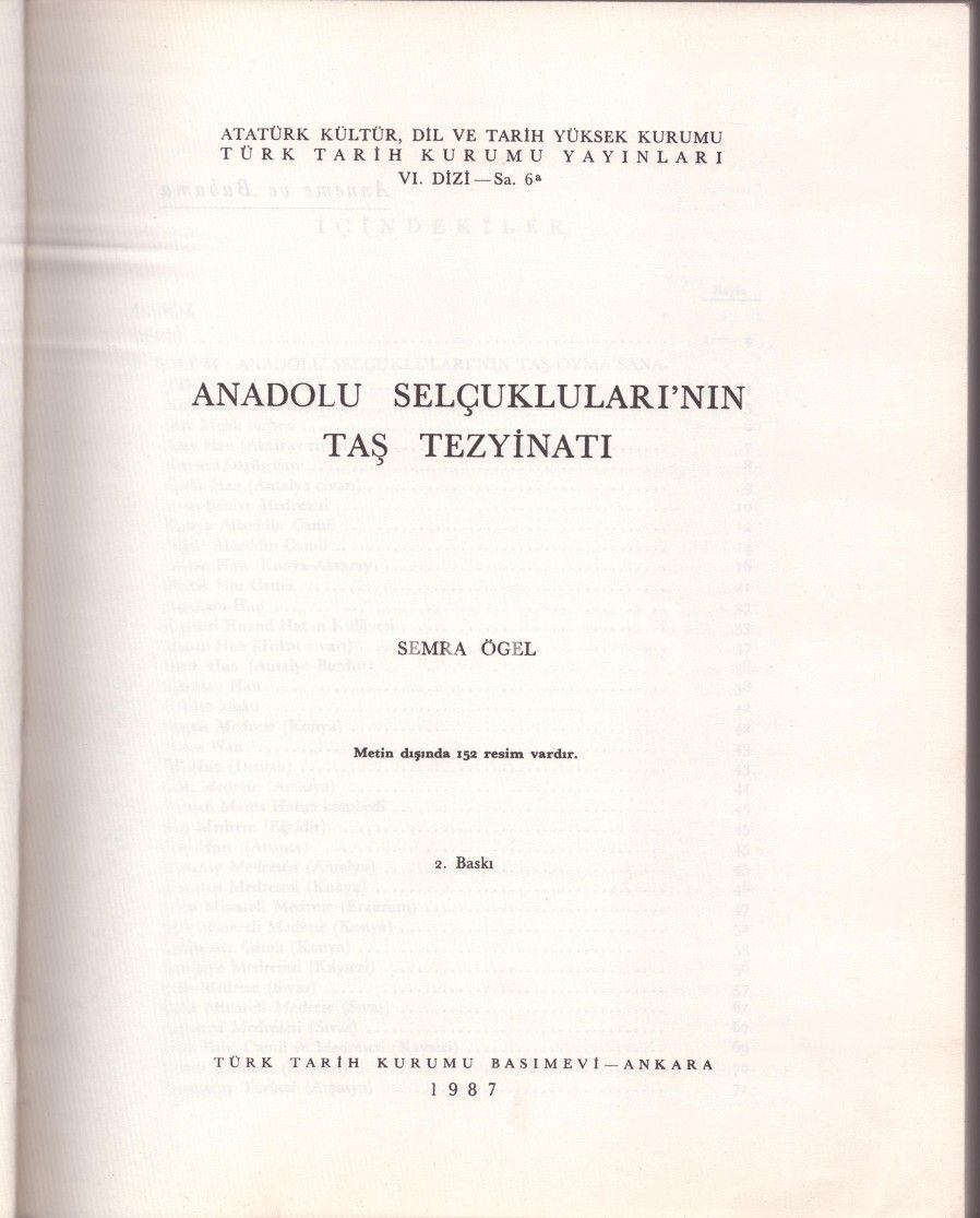 ANADOLU SELÇUKLULARI´NIN TAŞ TEZYİNATI, Semra Ögel, Türk Tarih Kurumu Yayınları, Ankara - 1987, 192+66 sayfa, 22x28 cm