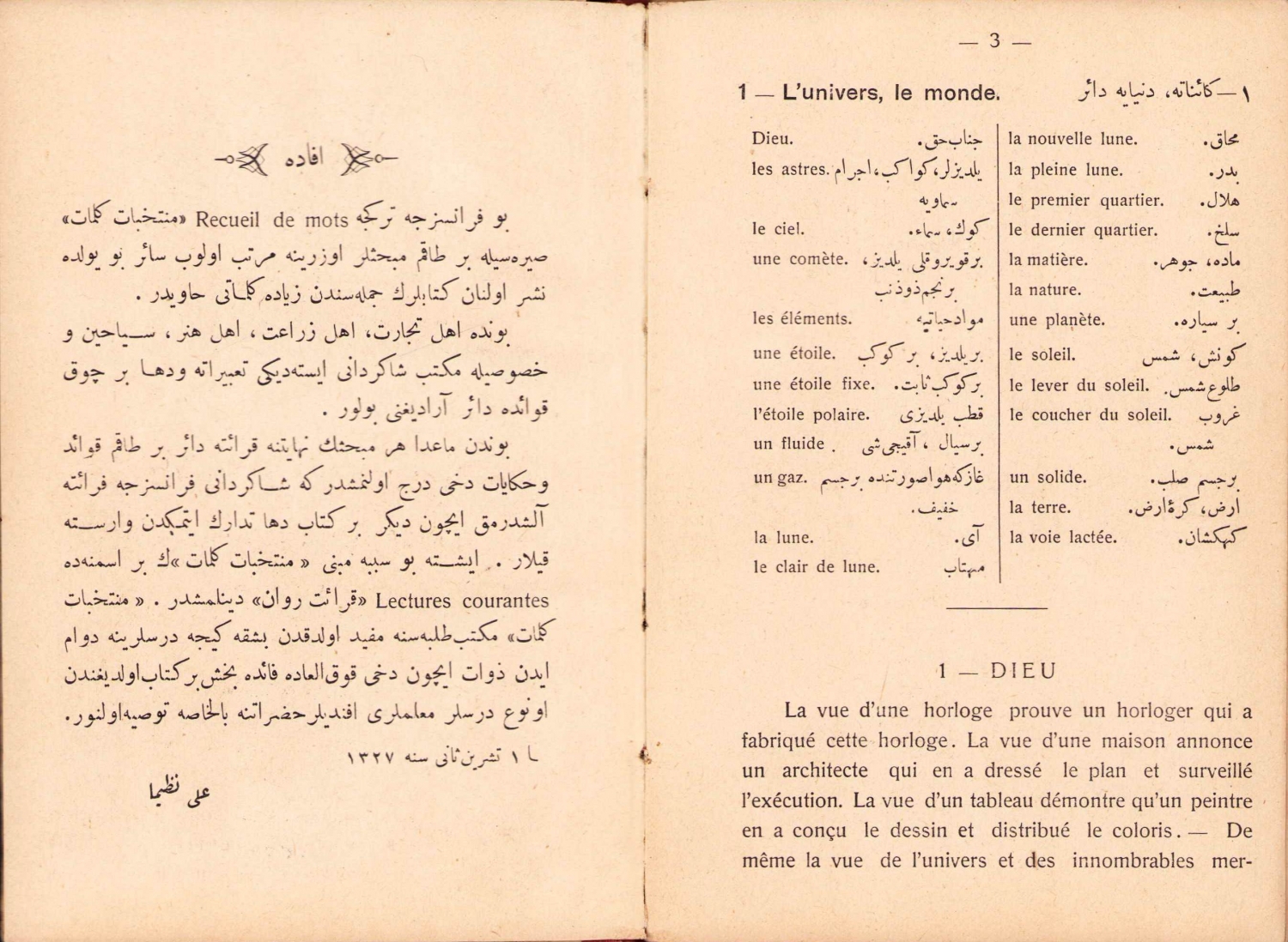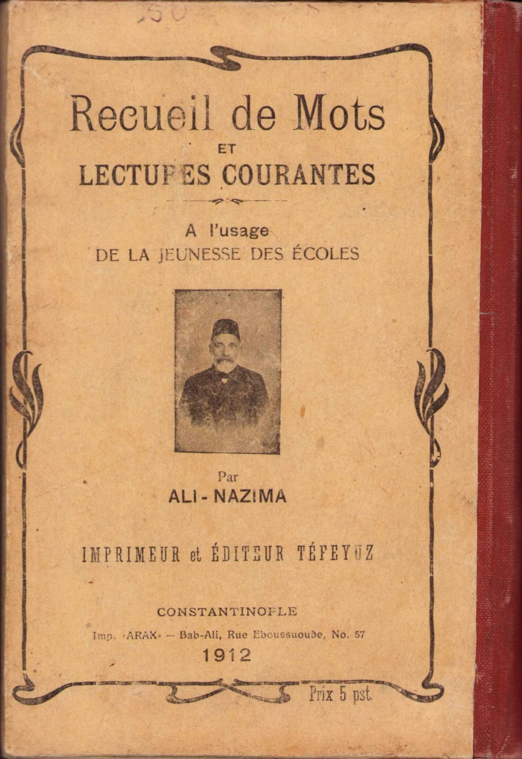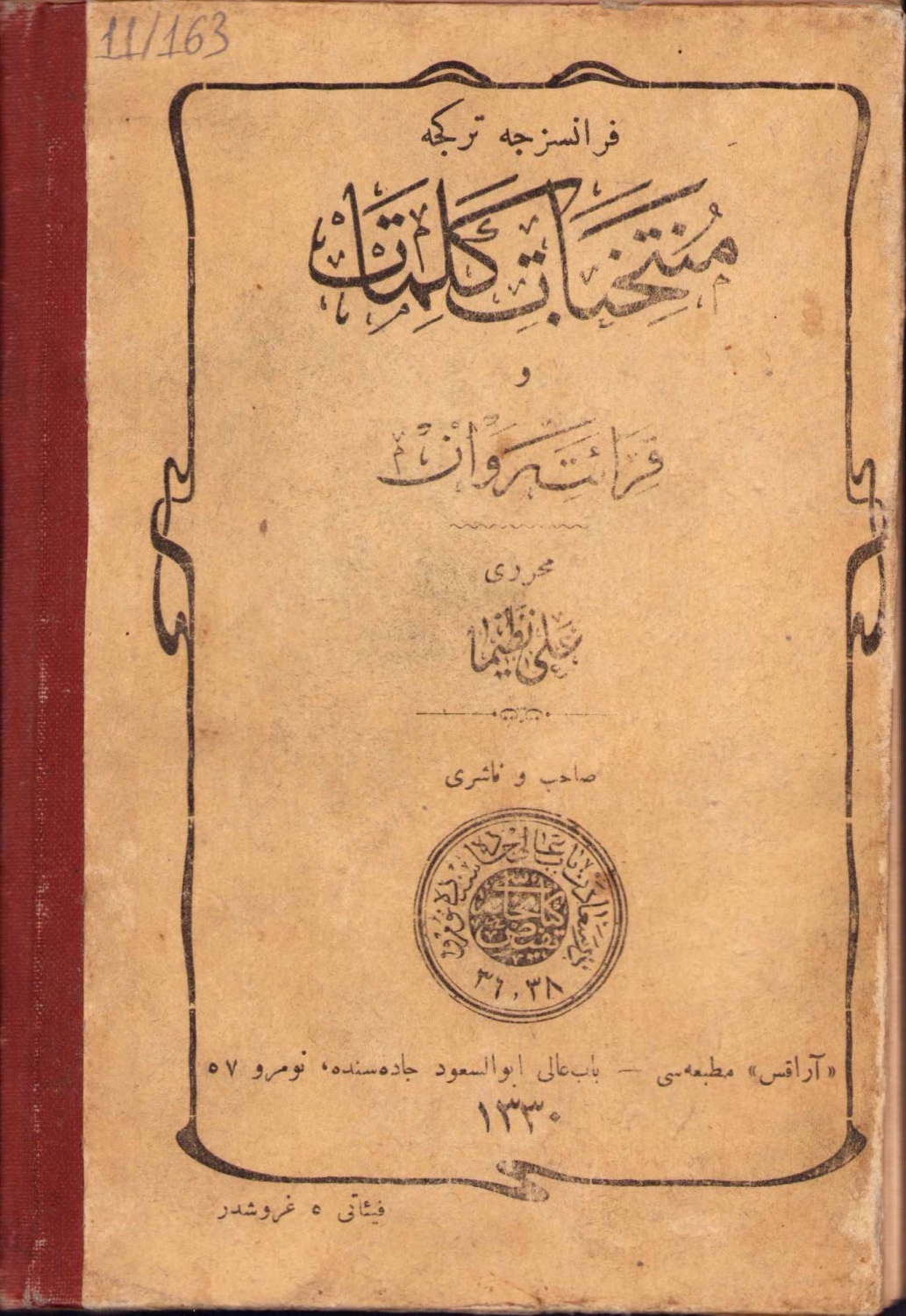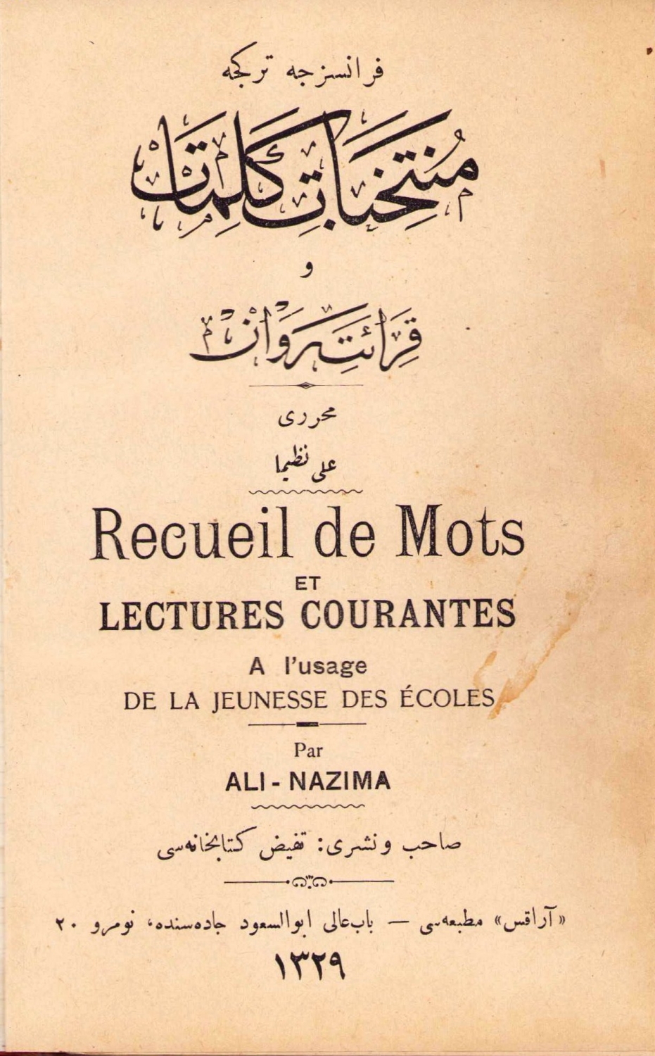Ali Nazima'nın Fransızca Türkçe Müntehabat-ı Kelimat eseri, Arakis Matbaası, 1330, 119 sayfa, 11x16 cm.
