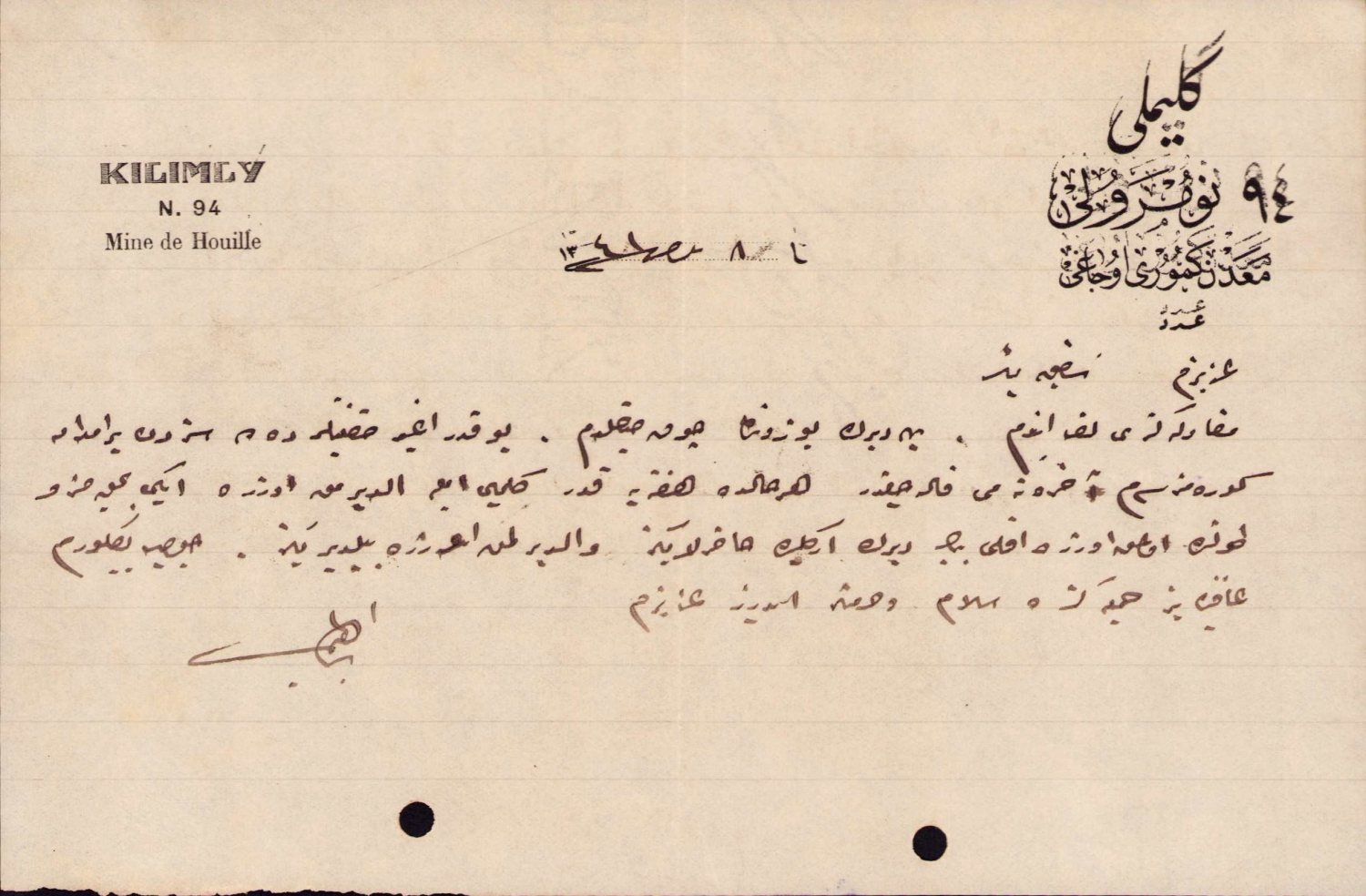 Osmanlıca Kilimli Maden Kömürü Ocağı antetli iş yeri dokümanı, 20x14 cm.