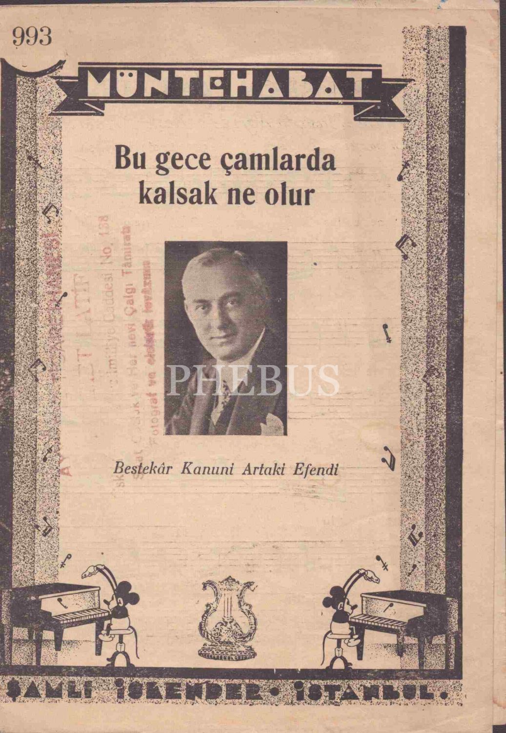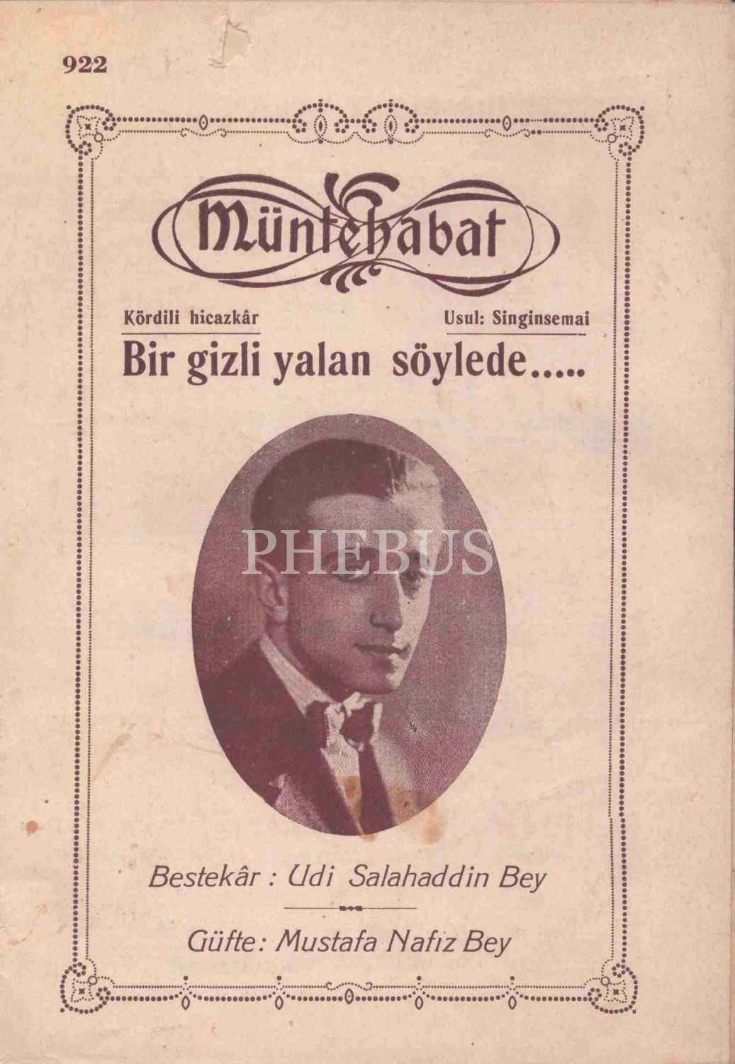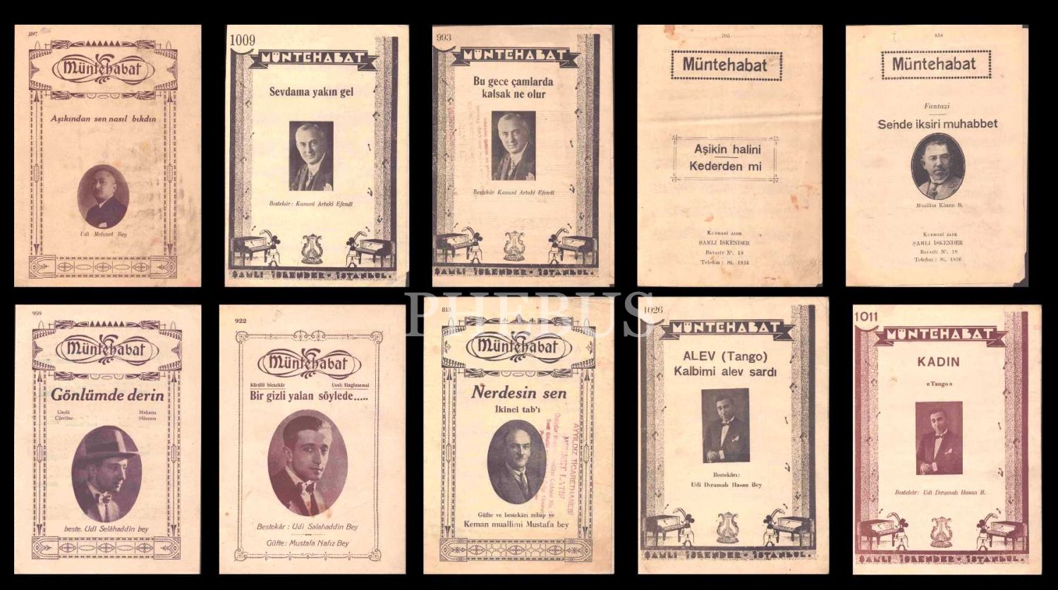 Notalar; Kanuni Artaki Efendi´ye ait "Sevdama Yakın Gel", "Aşikin Halini Kederden mi", "Bu Gece Çamlarda Kalsak Ne Olur"; Udi Dıramalı Hasan´a ait "Kadın", "Kalbimi Alev Sardı"; Mustafa Bey´e ait "Nerdesin Sen"; Muallim Kazım Bey´e ait "Sende İksiri Muhabbet"; Udi Salahaddin Bey´e ait "Bir Gizli Yalan Söylede", Gönlümde Derin"; Udi Mehmet Bey´e ait "Aşıkından Sen Nasıl Bıktın".