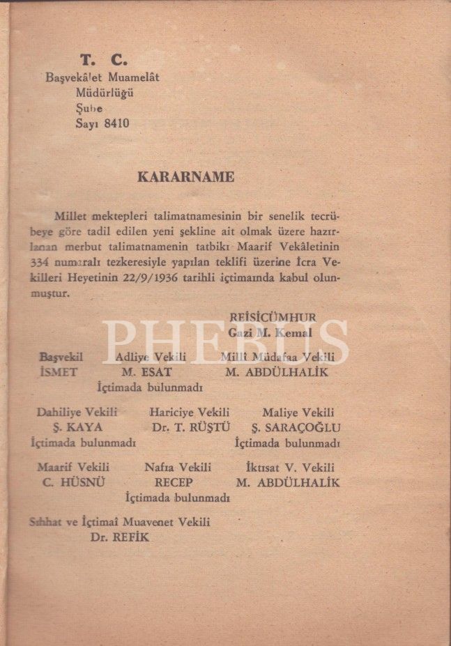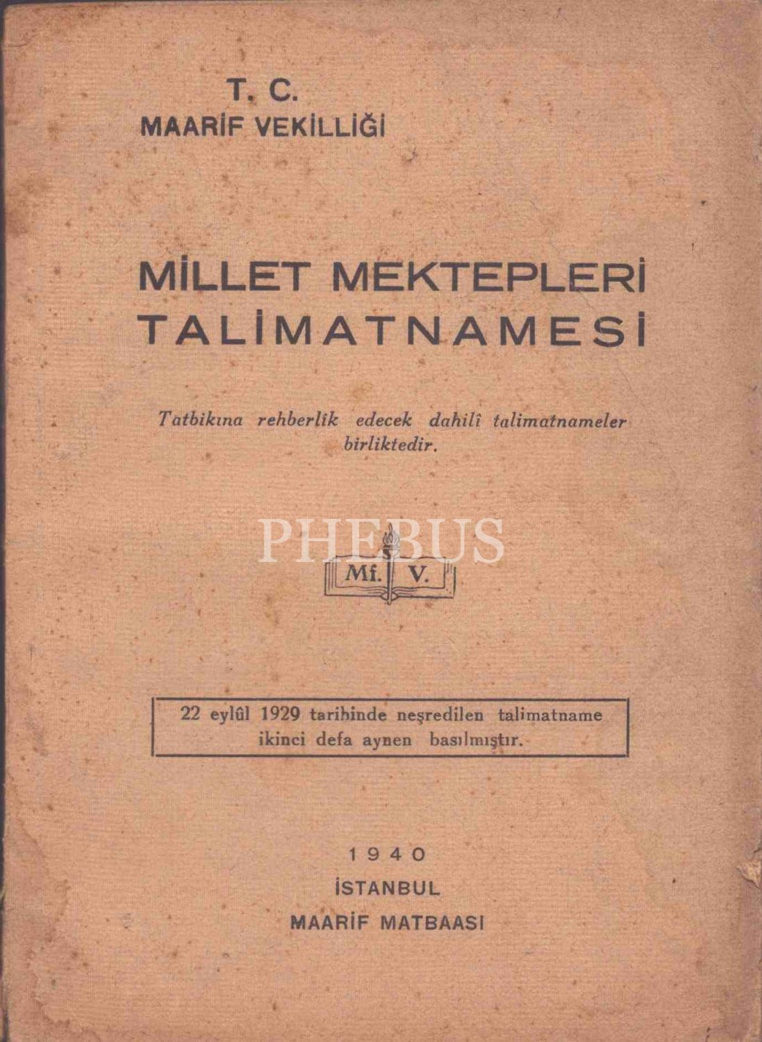 MİLLET MEKTEPLERİ TALİMATNAMESİ, Maarif Matbaası, İstanbul 1940, 16+7 s., 11x16 cm