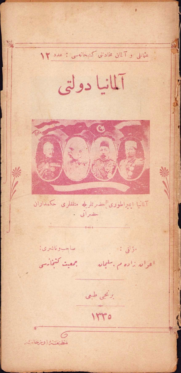Avanzade M. Süleyman'ın Osmanlıca Almanya Devleti kitabı 1335 yılı Orhaniye Matbaasında basılmıştır. Sırtı haliyle, 22 sayfa, 10x20 cm.