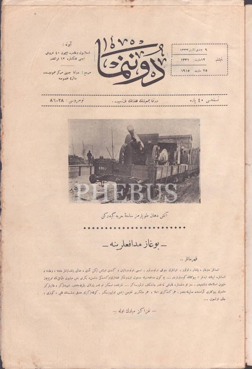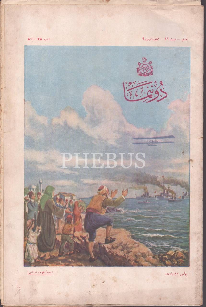 Donanma Cemiyetinin yayın organı DONANMA´nın "Atış Duhan Toplarımız Saha-i Harbe Giderken" başlıklı kapak görseliyle, 1333 tarihli 38. sayısı, 25x38 cm