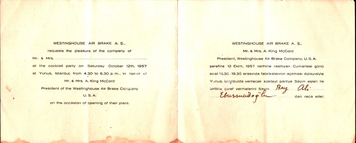 President Westinhouse Air Brake Company U.S.A şerefine düzenlenen 1957 tarihli kokteylin davetiyesi, 14x17 cm
