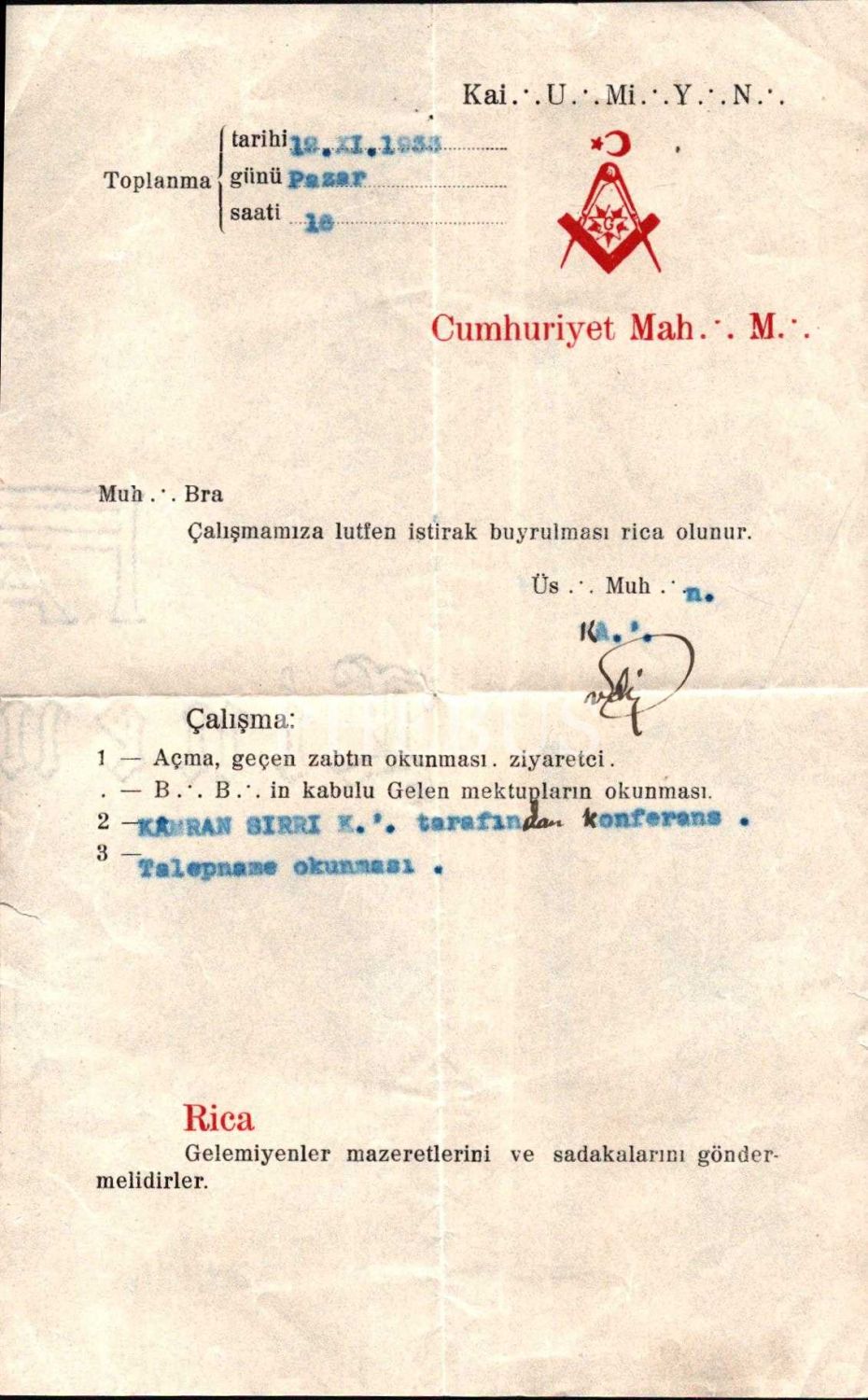 Mason Locası amblemli, 1933 tarihli davetiye, 14x23 cm