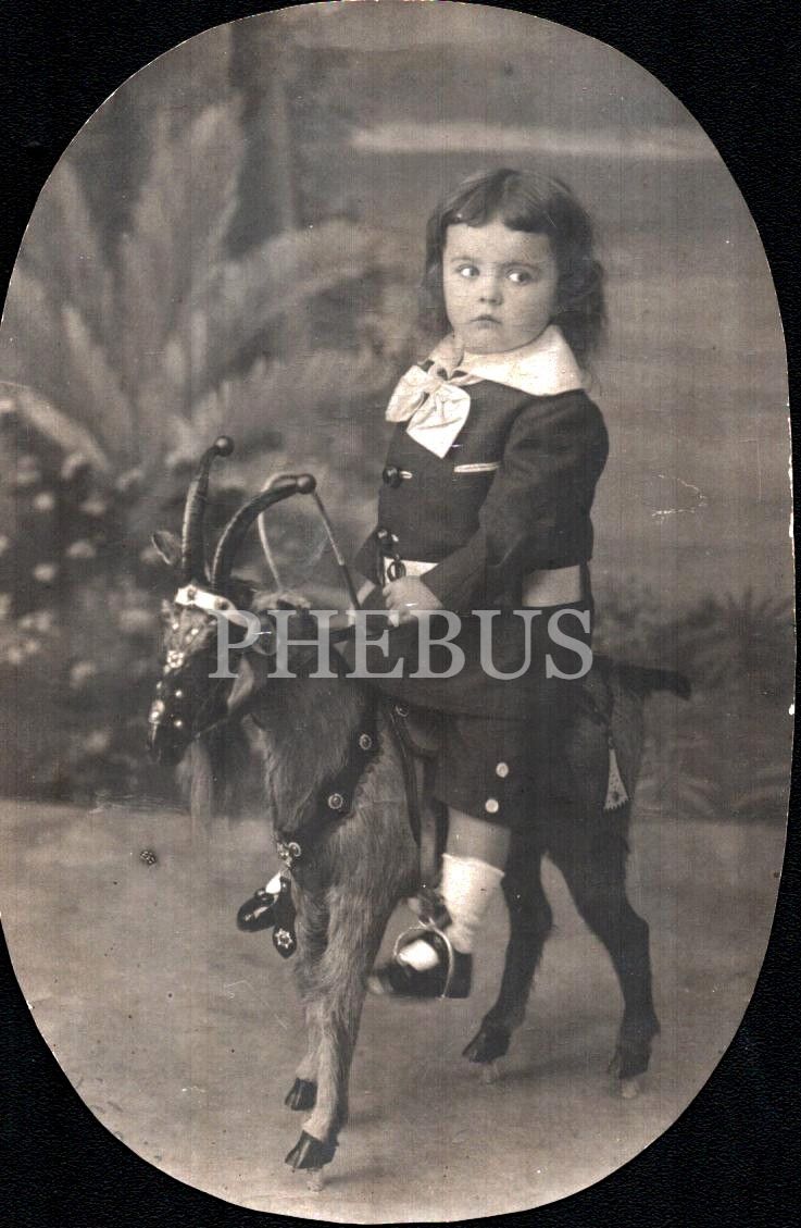 Oyuncak keçi üzerinde poz veren sevimli kız çocuğu, 10x15 cm