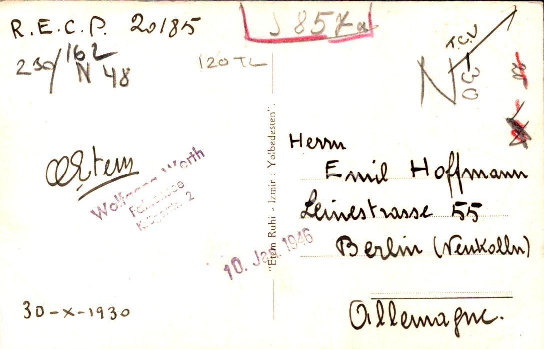 İzmir Saat Kulesi görselli, Emil Hoffman´a gönderilmiş kartpostal
