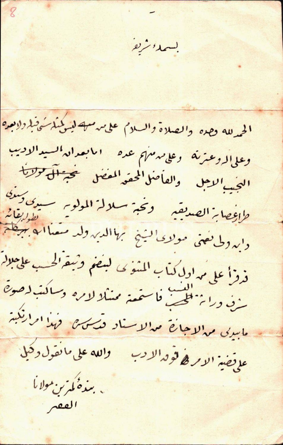 "Bende-i Kemterîn-i Mevlânâ el-Fakir" imzasıyla kaleme alınan Arapça yazı, 13x21 cm