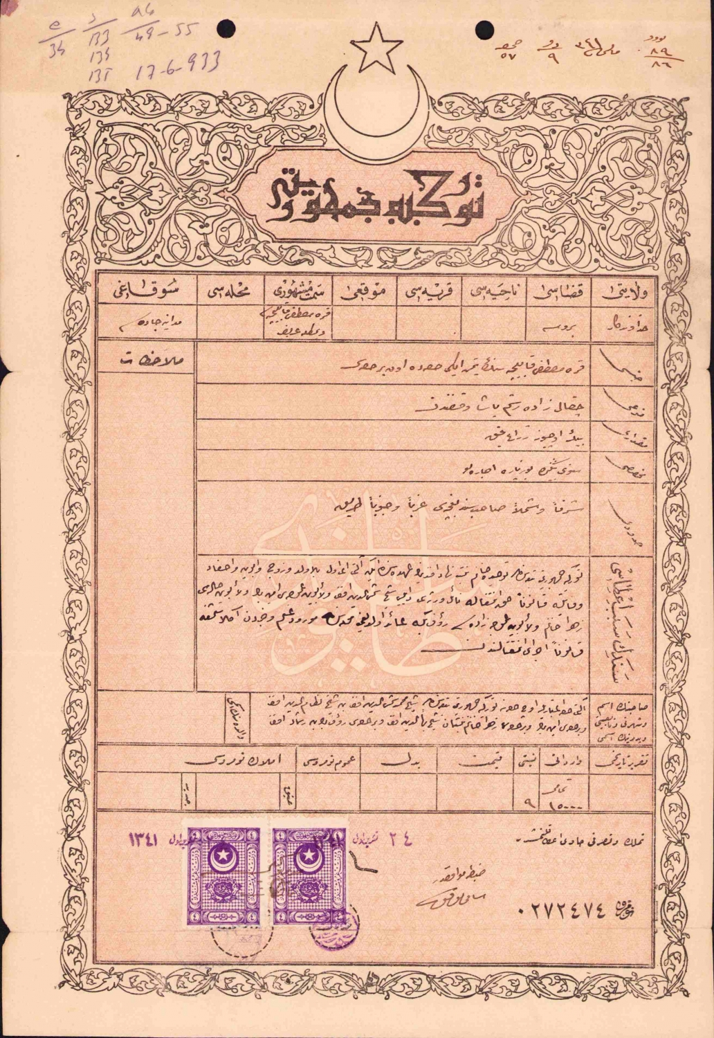 Orjinal cildinde Osmanlı tapu senedi, Bursa - Hüdavendigar, hicri 1341, 22x32 cm.