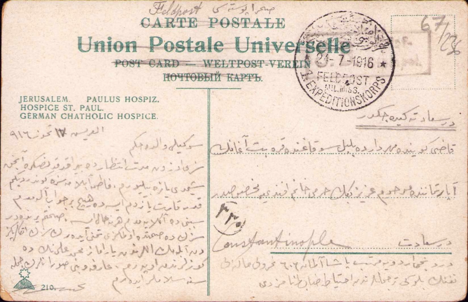 Kudüs Alman Katolik Darülaceze, arkası Osmanlıca ithaflı, 1916.