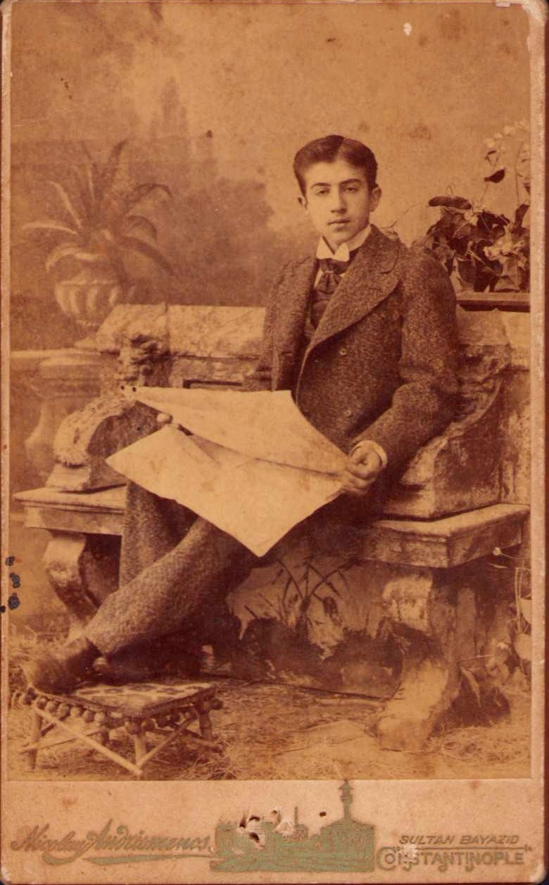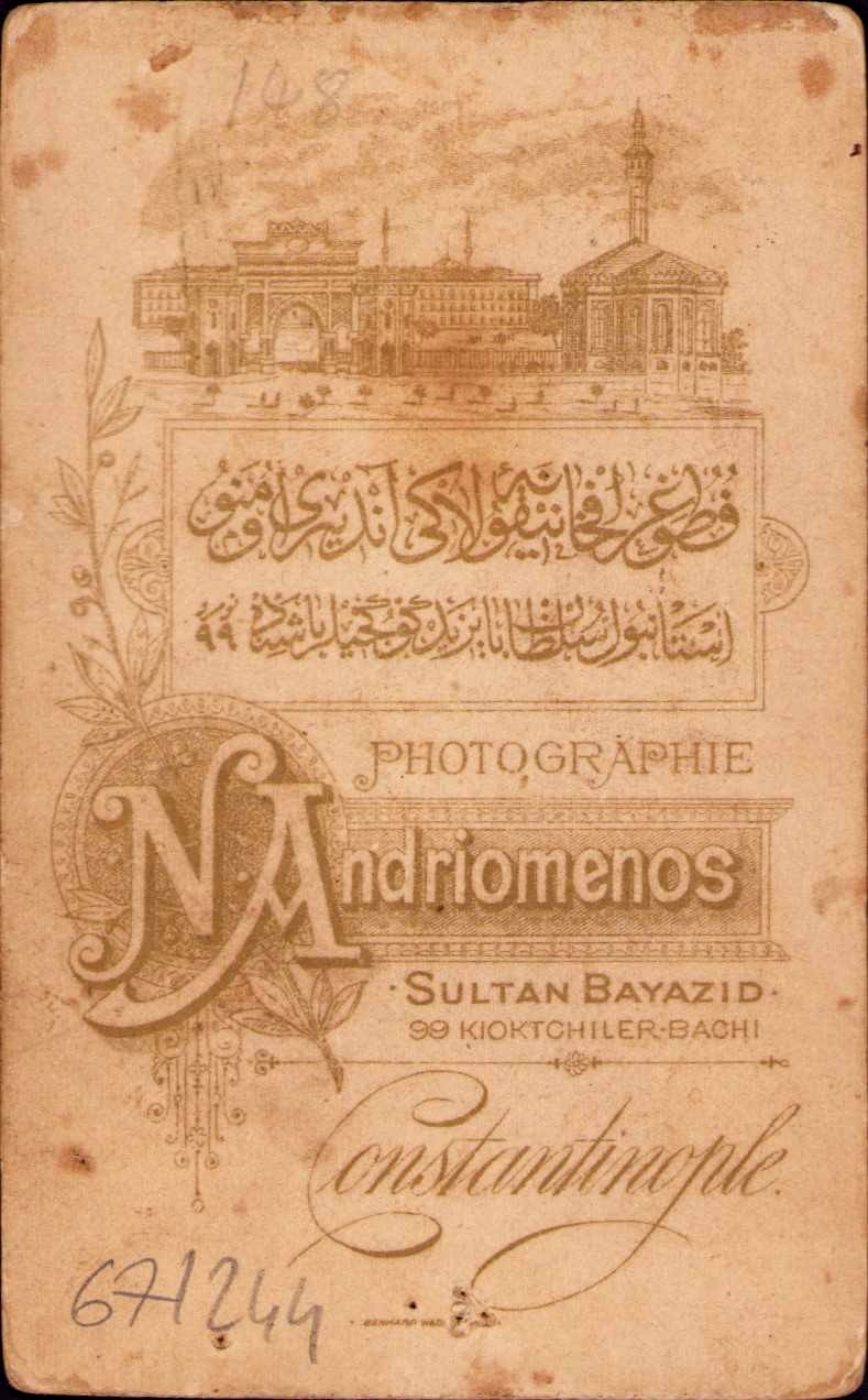 Osmanlıca - Fransızca iki dilde Nicolay Andriomenos Fotoğrafhanesi, Constantinople, Gazete okuyan beyefendi, kabin foto, 6x11 cm.