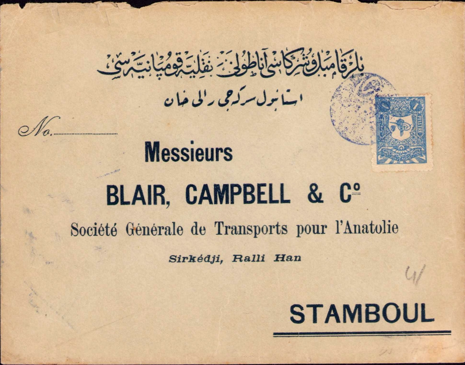 Osmanlıca - Fransızca Blair, Campbell ve Şürekası Anadolu Nakliyat Kumpanyası, İstanbul antetli zarf, damgalı.