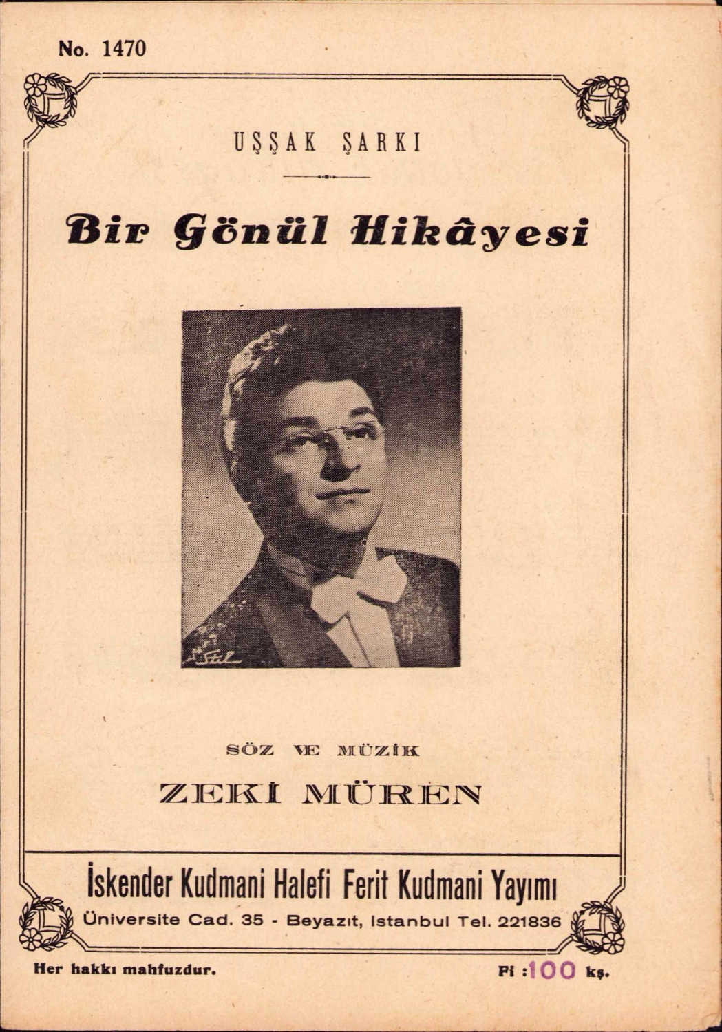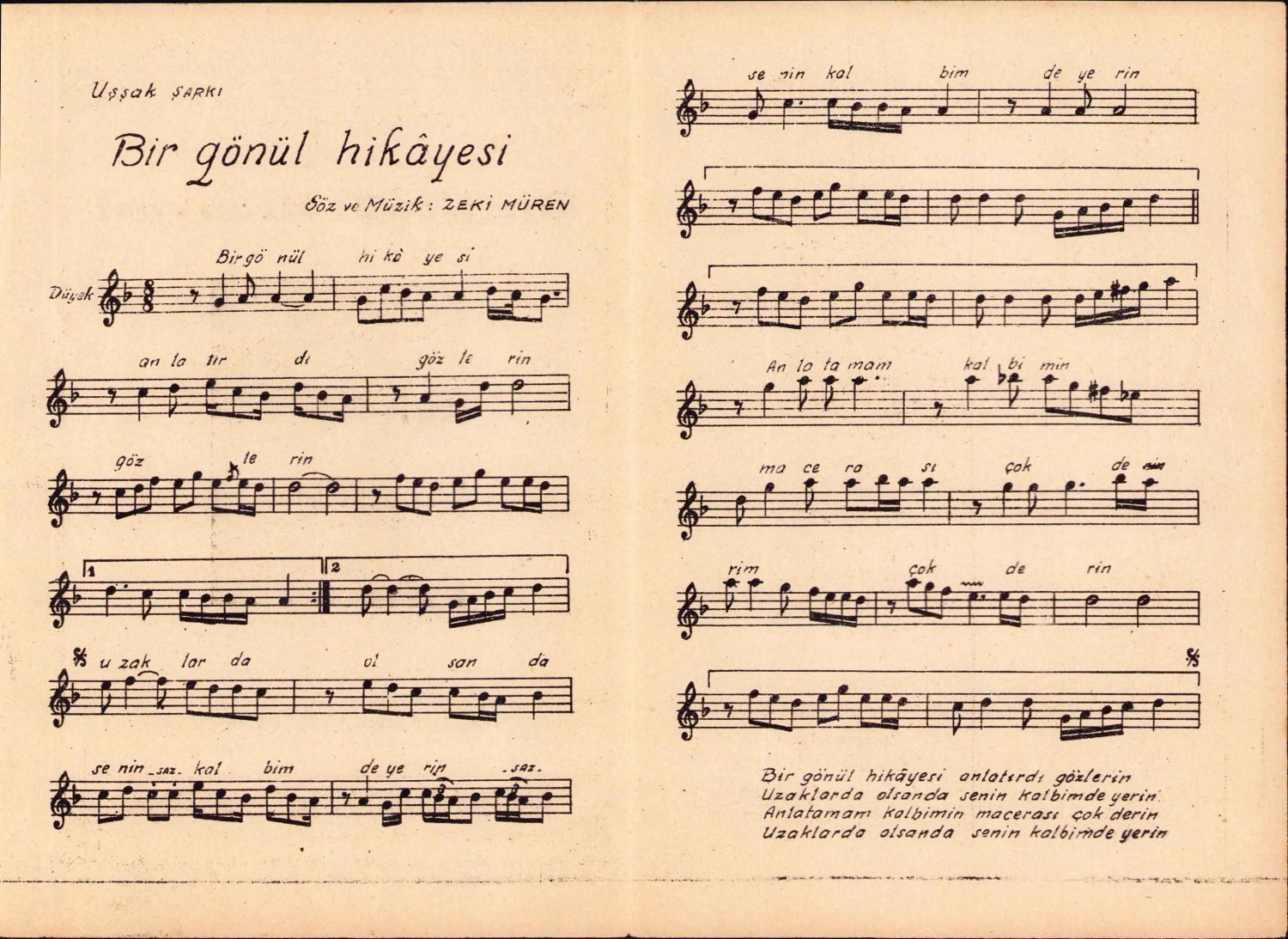 Söz ve Müziği Zeki Müren olan 'Bir Gönül Hikayesi' şarkı notası, 4 sayfa, 14x20 cm.