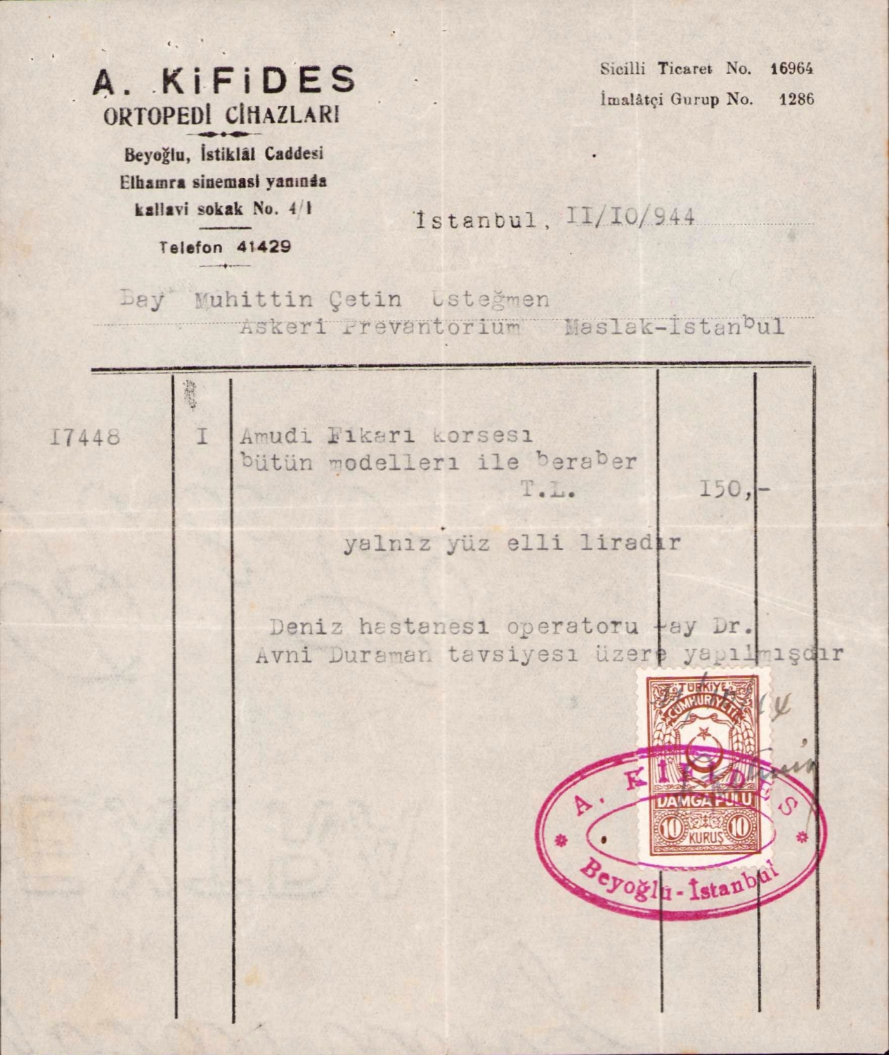 A. Kifidis Ortopedi Cihazları, Beyoğlu antetli fatura, 14x18 cm.