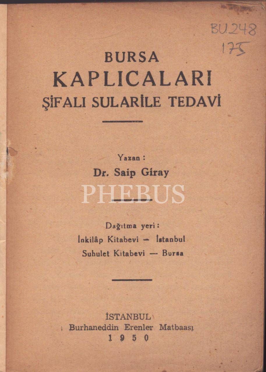 BURSA KAPLICALARI - ŞİFALI SULARİLE TEDAVİ, Dr. Saib Giray, İnkilâp Kitabevi, İstanbul - 1950, 160 sayfa, 12x16 cm