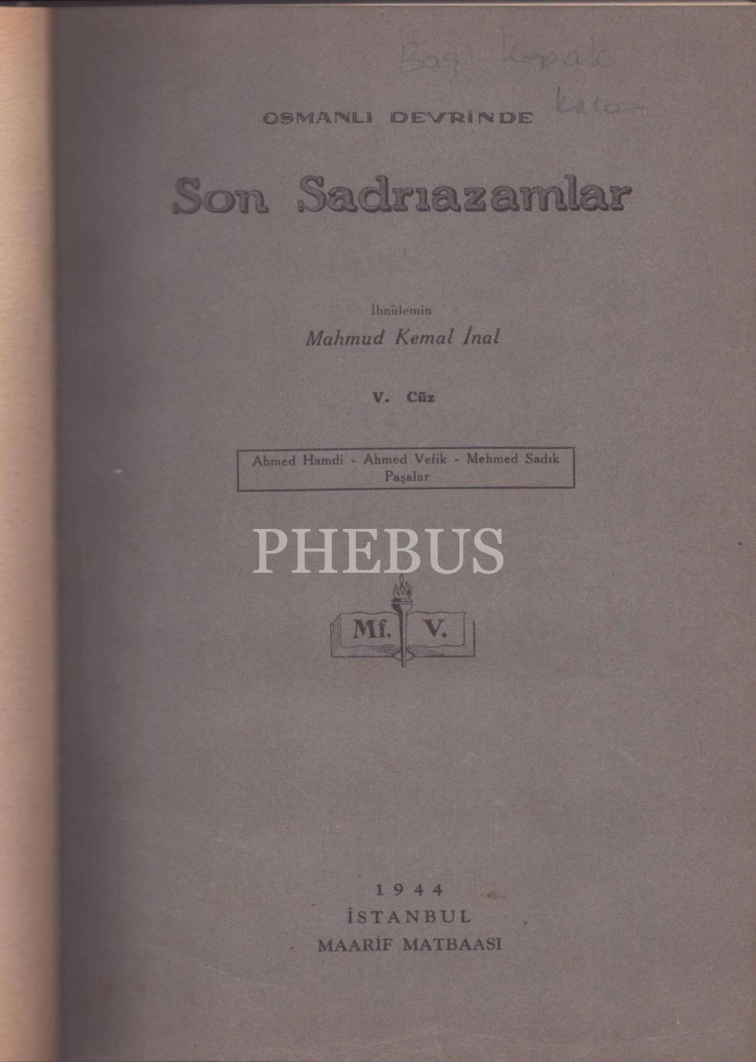 OSMANLI DEVRİNDE SON SADRAZAMLAR (2. Cilt 5. Kısım: Ahmed Hamdi - Ahmed Vefik - Mehmed Sadık Paşalar), İbnülemin Mahmud Kemal İnal, Maarif Matbaası, İstanbul - 1944, 799 sayfa, 17x24 cm