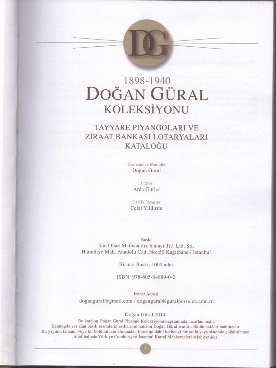 DOĞAN GÜRAL KOLEKSİYONU: Tayyare Piyangoları ve Ziraat Bankası Lotaryaları Kataloğu (1898-1940), ed. Arda Gürler, Şan Ofset Matbaacılık, İstanbul 2014, 400 sayfa, 22x30 cm