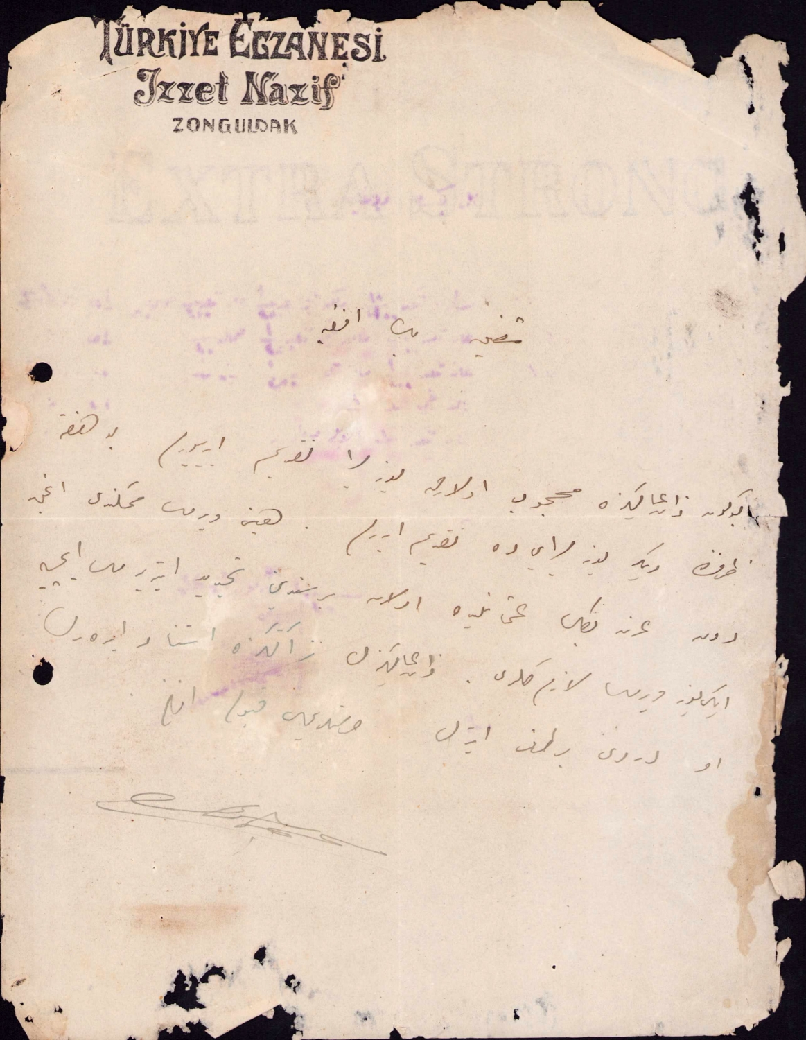 Türkiye Eczanesi İzzet Nazif - Zonguldak antetli Osmanlıca yazılı iş yeri dokümanı, haliyle, 20x28 cm.