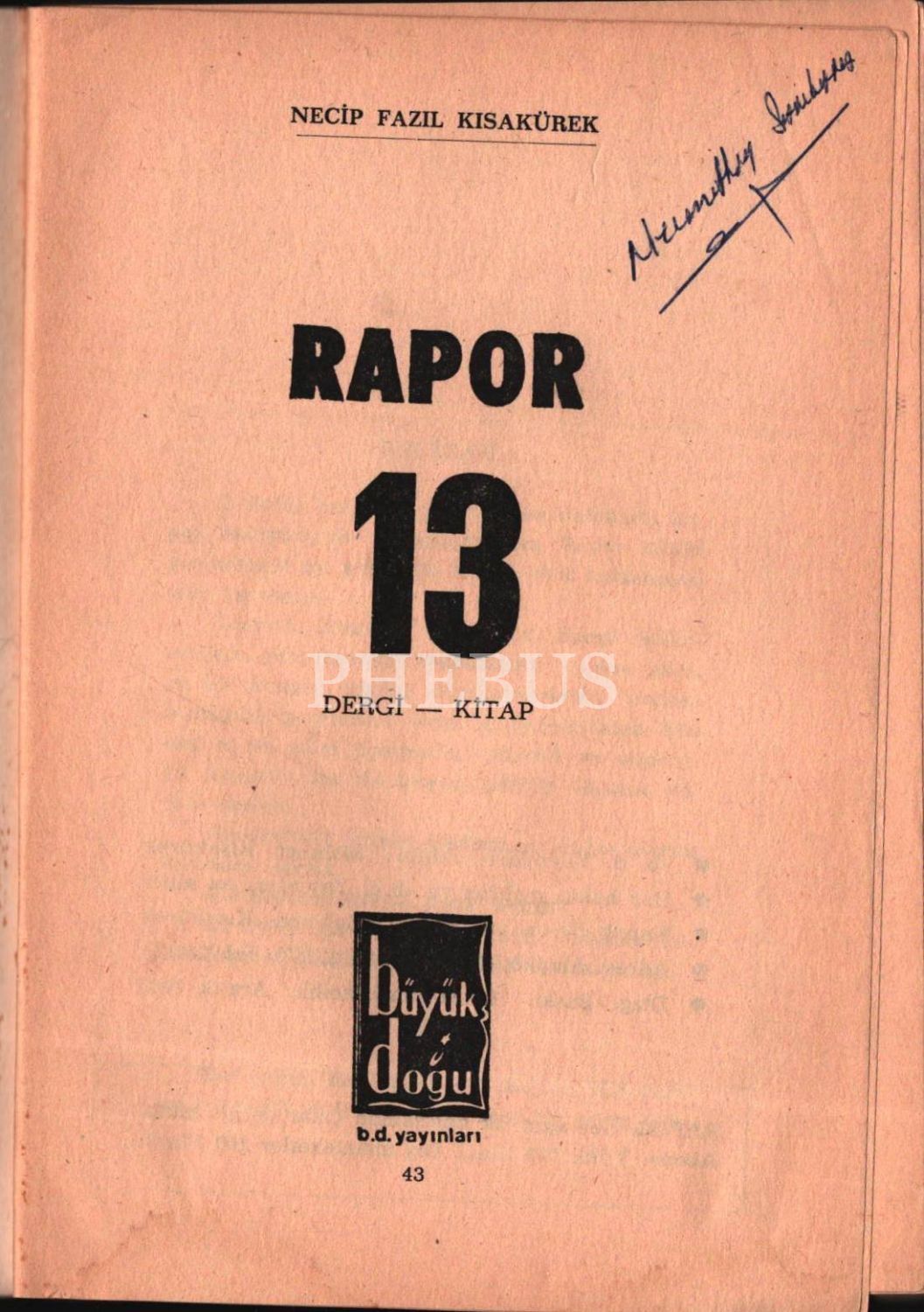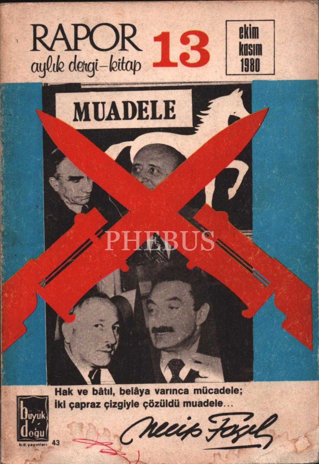Necip Fazıl Kısakürek tarafından çıkarılan "aylık dergi-kitap" RAPOR´un 1976-80 yılları arasında yayınlanan 13 sayılık tam takımı, 14x20 cm