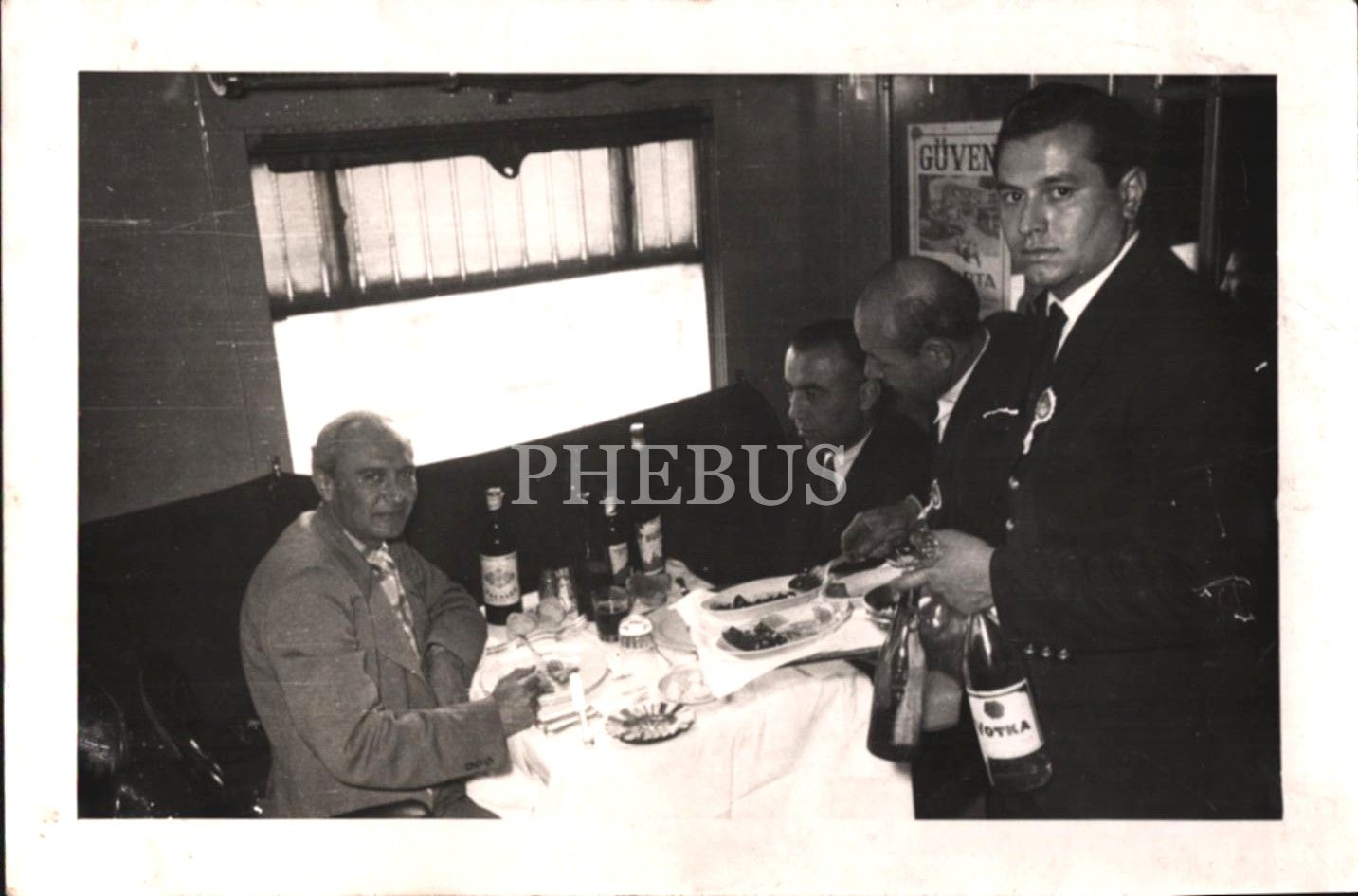 Dönemin içki şişeleri ile Güven Sigorta reklamlı duvar takviminin görüldüğü bir yemek vagonu hatırası, 18x12 cm