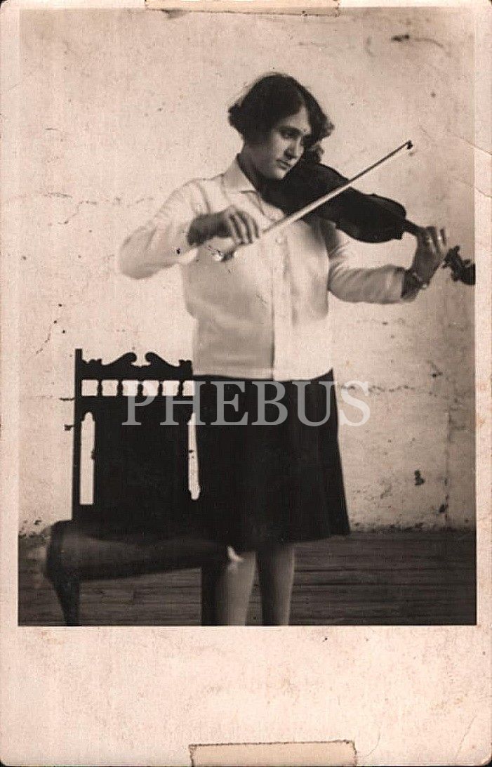 Kemanıyla poz vermiş genç kız, arka yüzü Osmanlıca ithaflı, 9x14 cm
